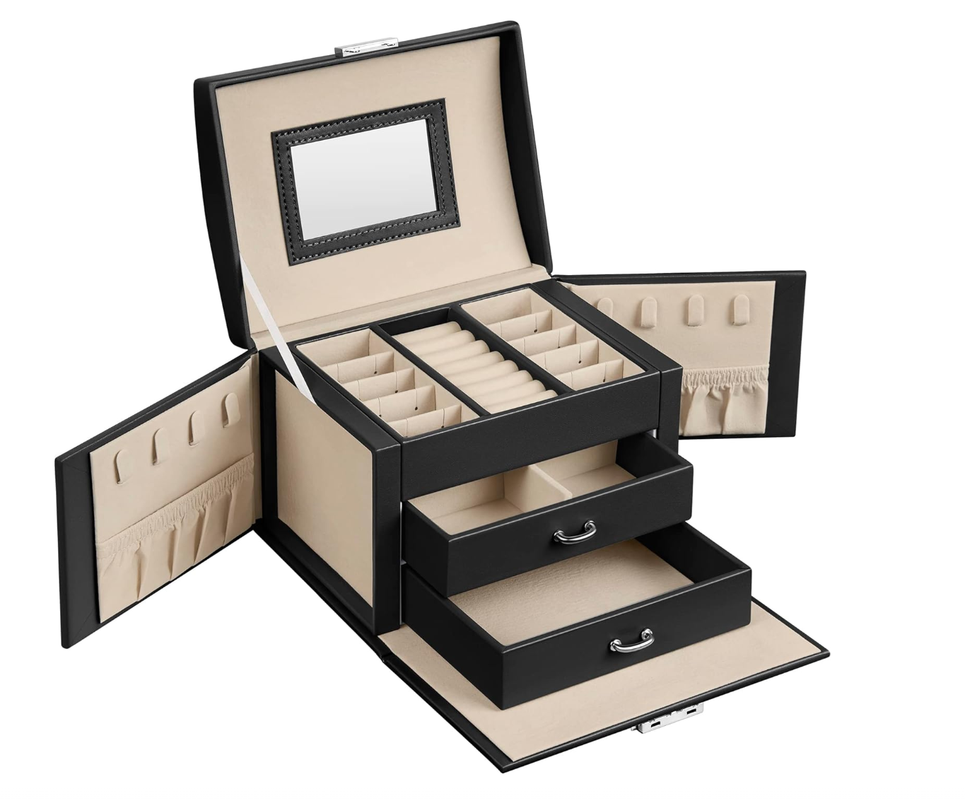 This jewellery case features a clear mirror on the lid to make it convenient for you to apply makeup, put on or take off jewellery, and check your look before going out.