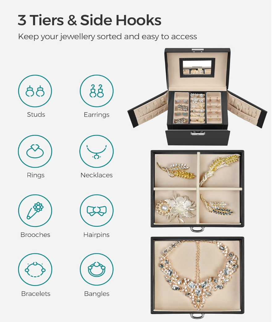 Keep your various jewels organized with this spacious jewellery box. It boasts multiple necklace hooks on both sides and 3 tiers of storage with lots of different compartments.