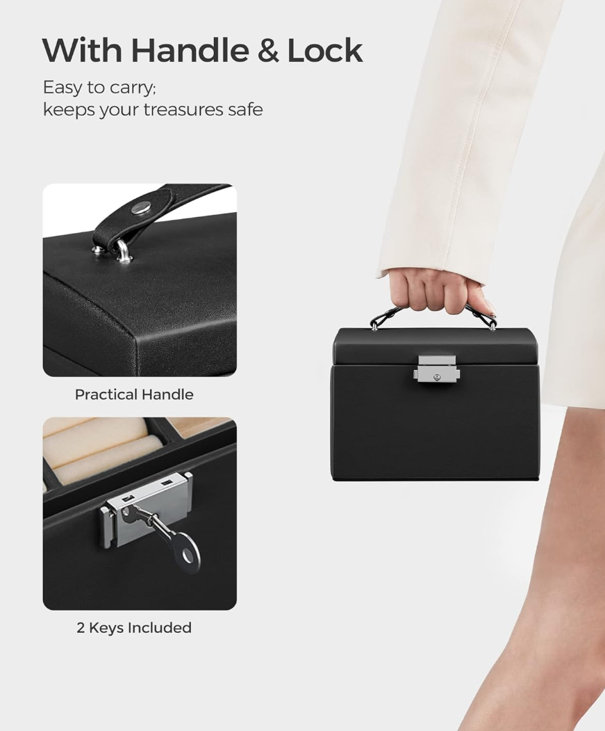 The jewellery organizer locks with 2 keys to keep your treasured pieces away from naughty kids; thanks to the handle on the top, the small jewellery case is portable for travel use.