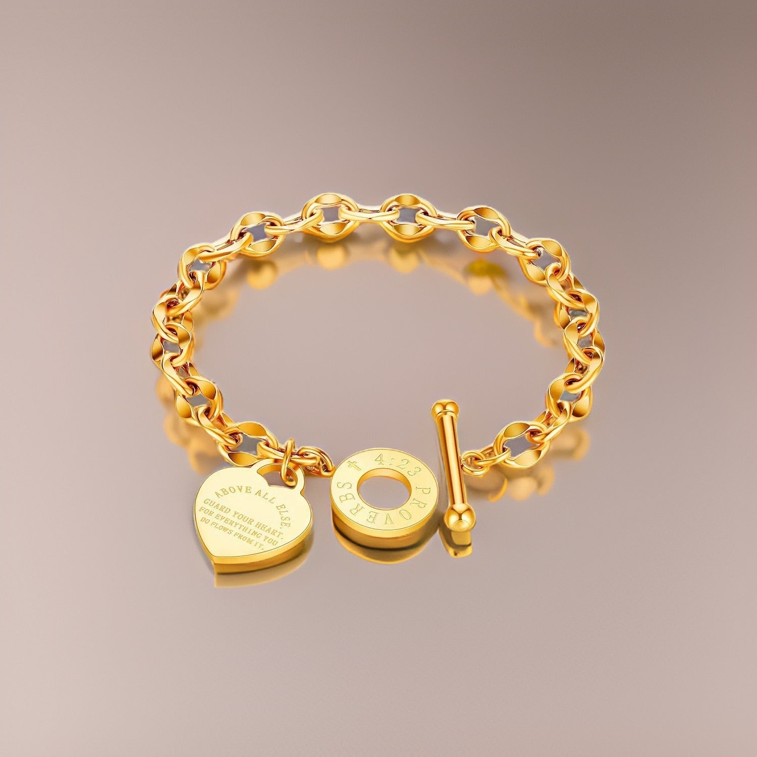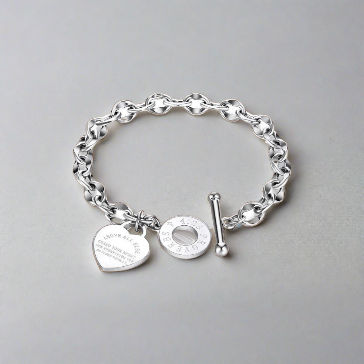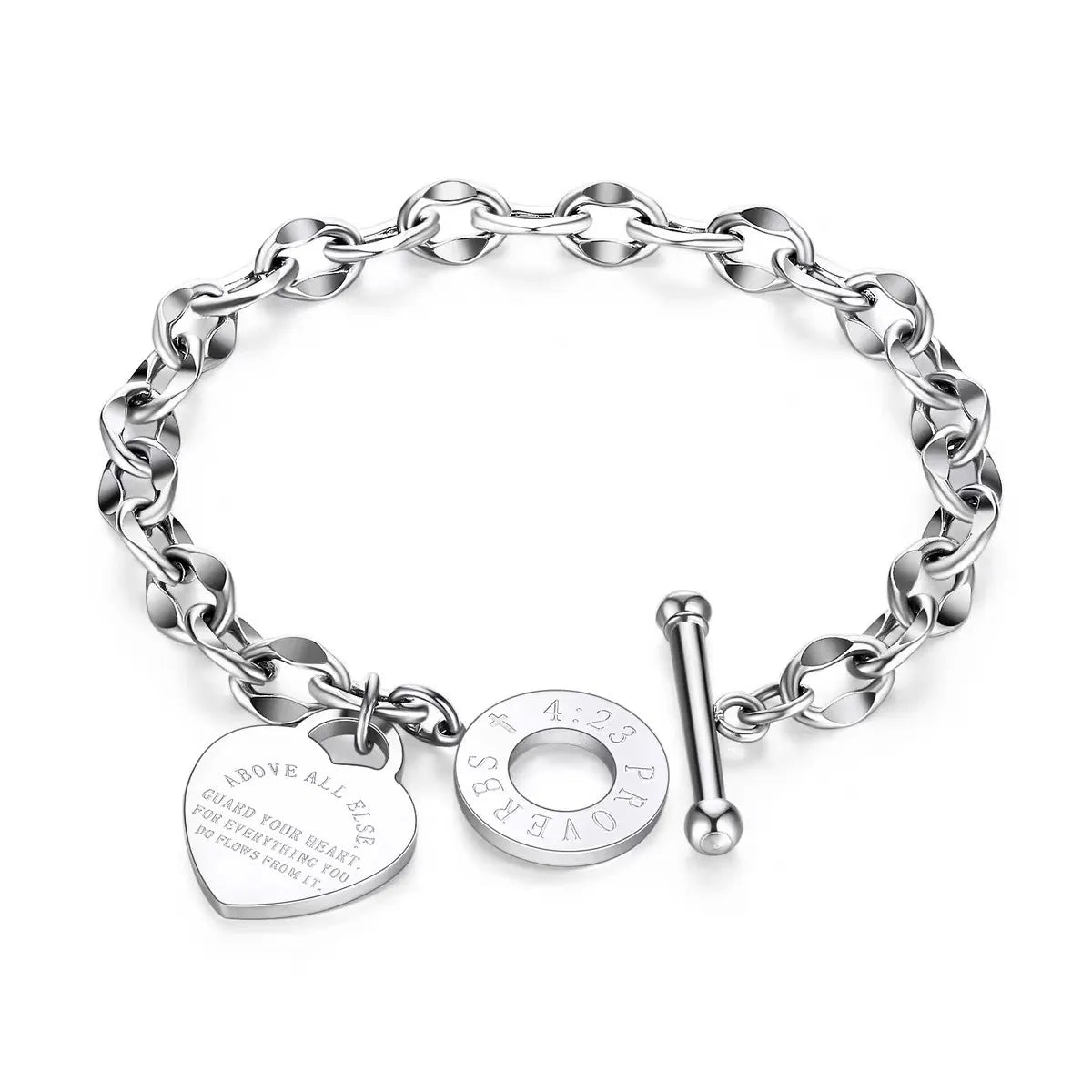 Made from high-quality stainless steel, this bracelet features a delicate link chain and a heart pendant engraved with the powerful Proverbs 4:13 verse. Its timeless design adds a touch of elegance to any outfit, making it perfect for both casual and formal occasions.