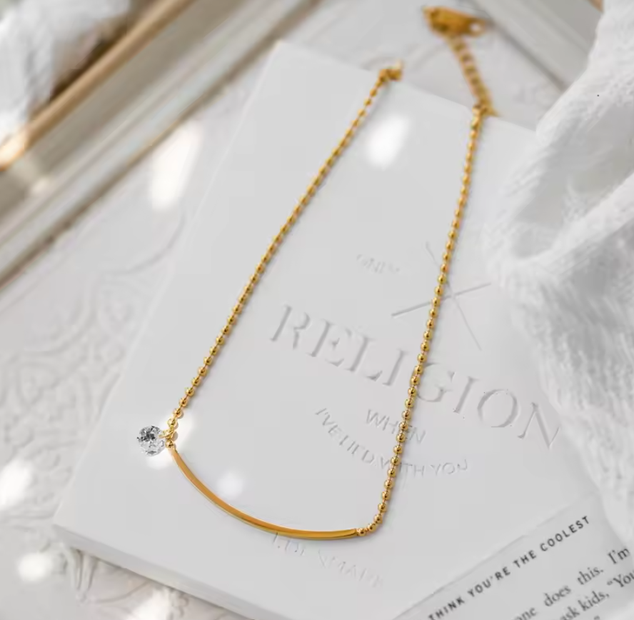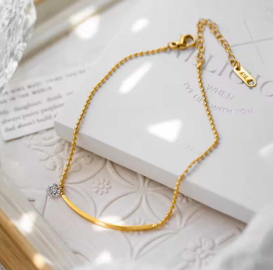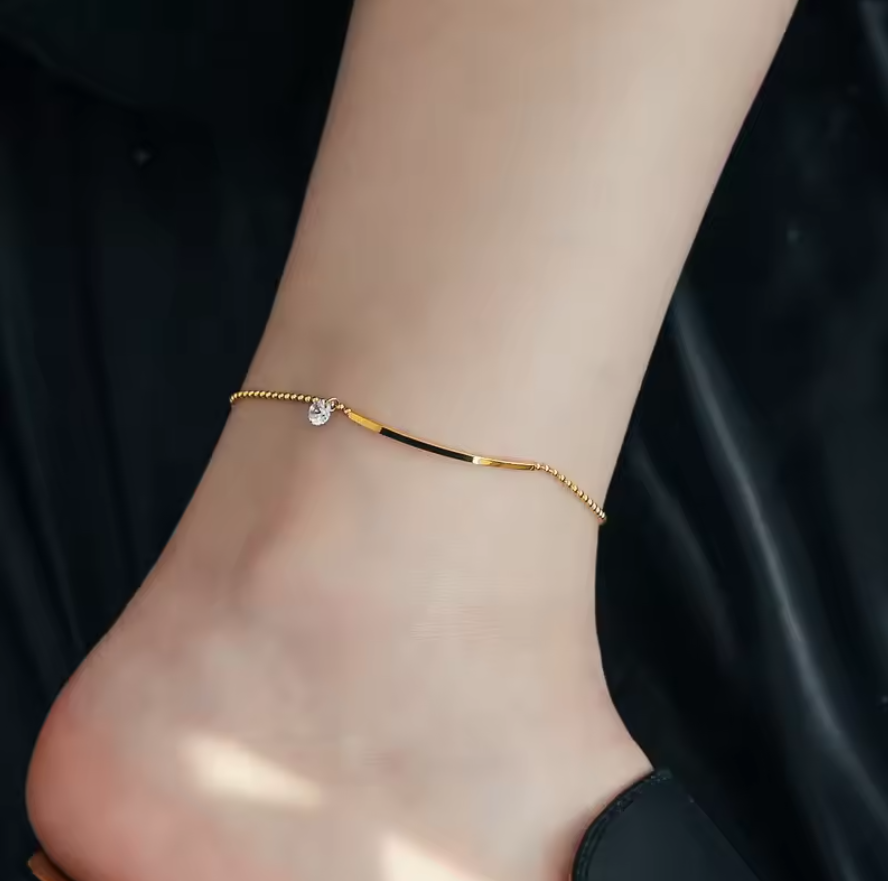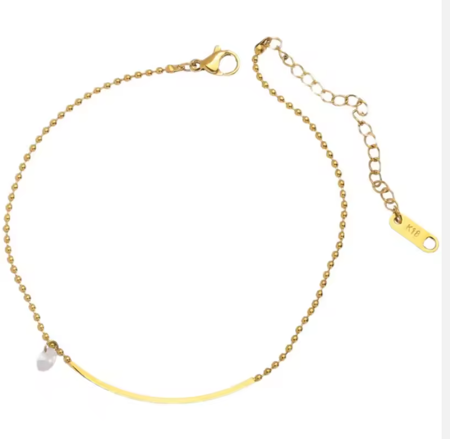 Crafted with 18k gold plating, this anklet features a delicate beaded chain, adorned with a sleek gold bar at the front and a sparkling crystal on the side. Its adjustable size ensures a perfect fit for everyone.
