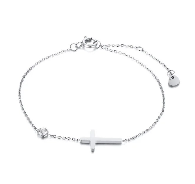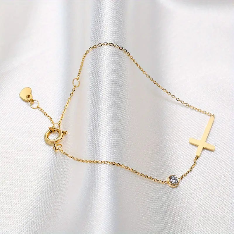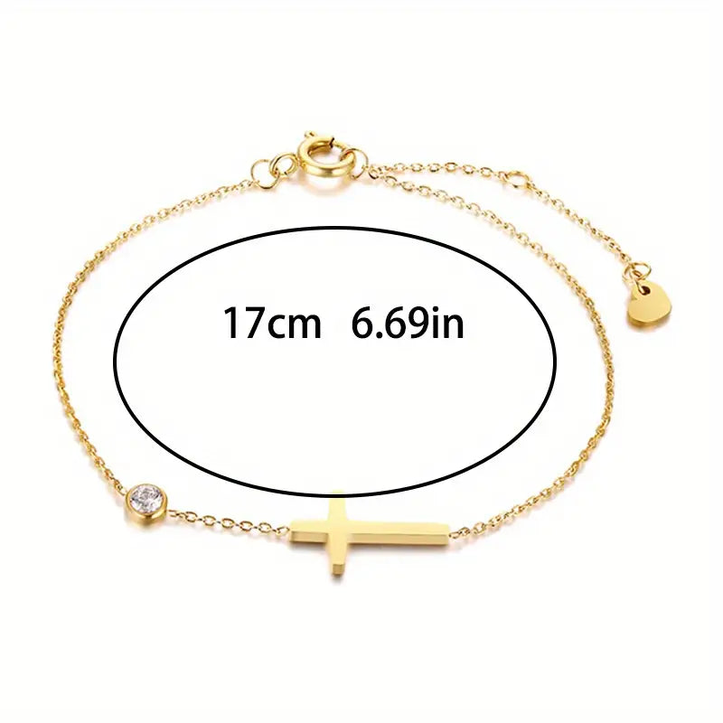 Crafted with stainless steel, this dainty chain bracelet is adorned with a beautiful golden cross, and shinning zircon diamond that catches the light beautifully.