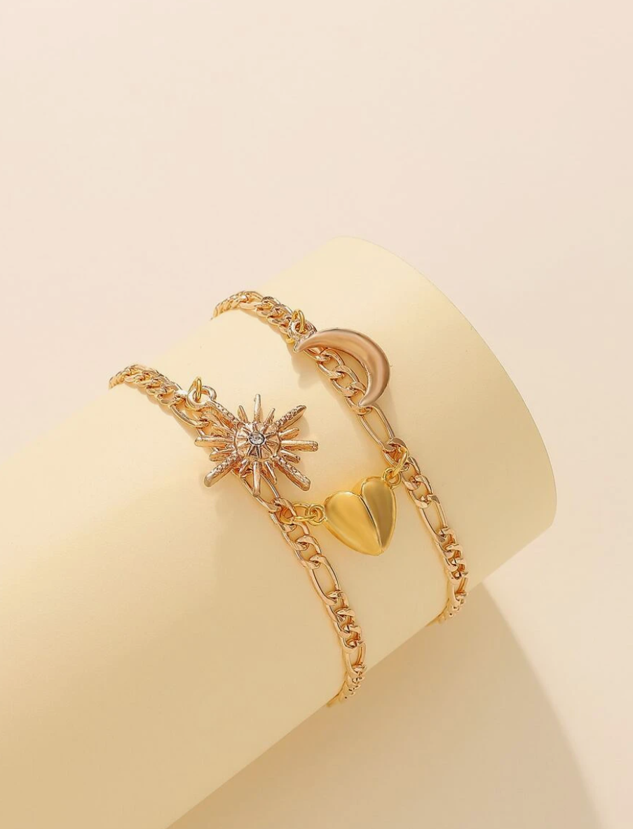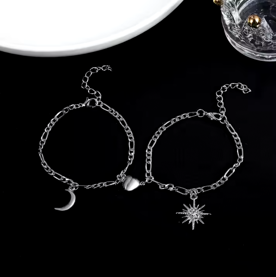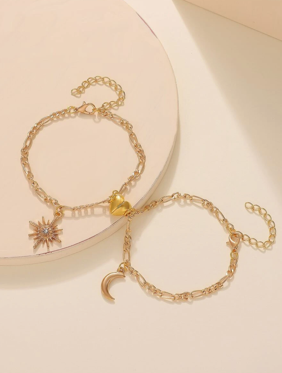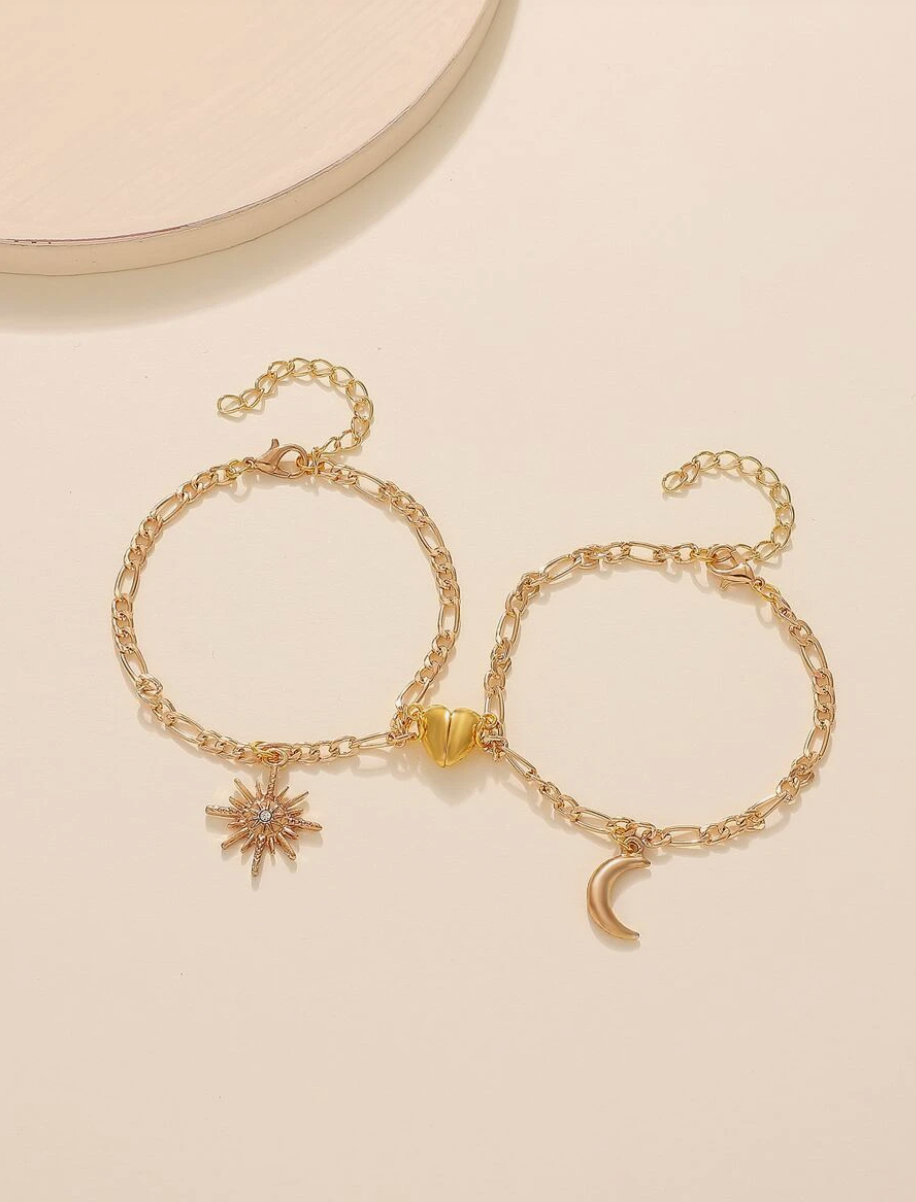 Crafted with 14K gold-plated Cuban links, these bracelets come as a pair, connected by a magnetic heart. One bracelet features a delicate moon charm, while the other showcases a radiant sun.