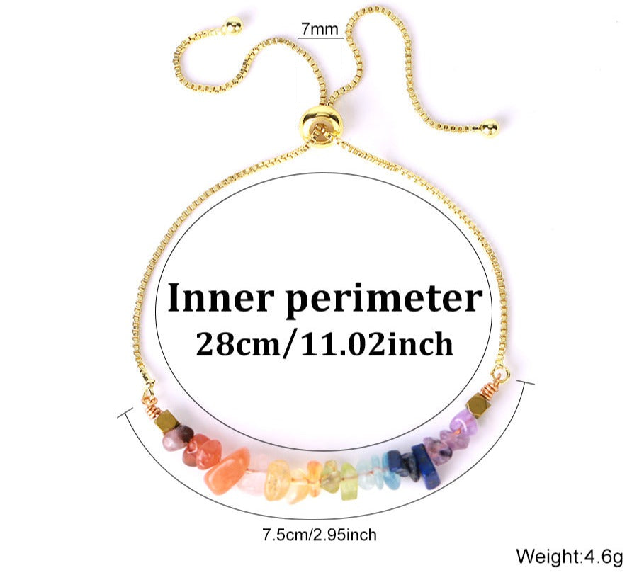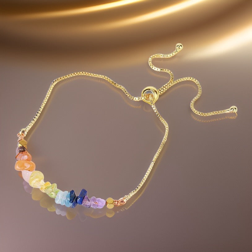 Crafted with a luxurious stainless steel gold bracelet, this stunning piece features vibrant colored crystals representing the seven chakras, effortlessly balancing your mind, body, and soul.