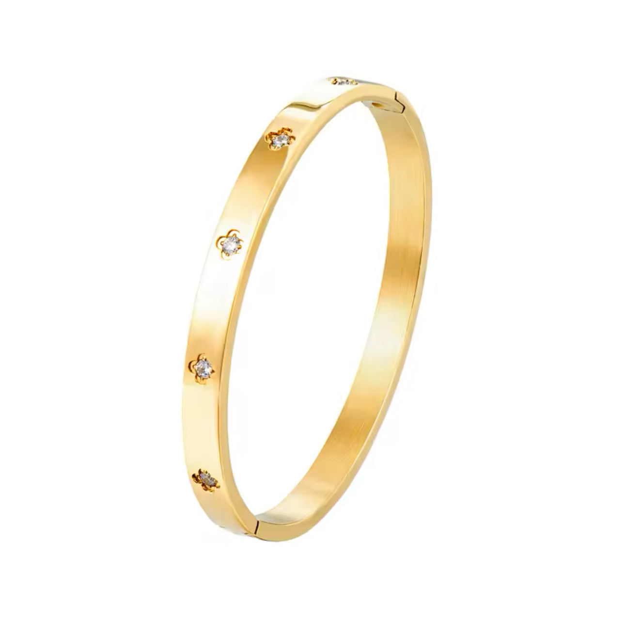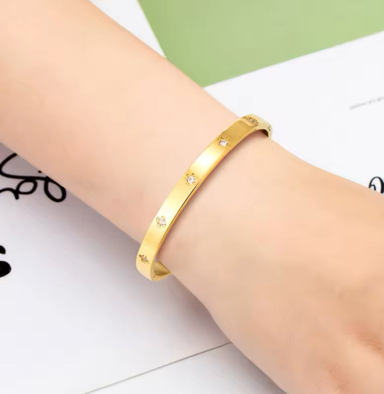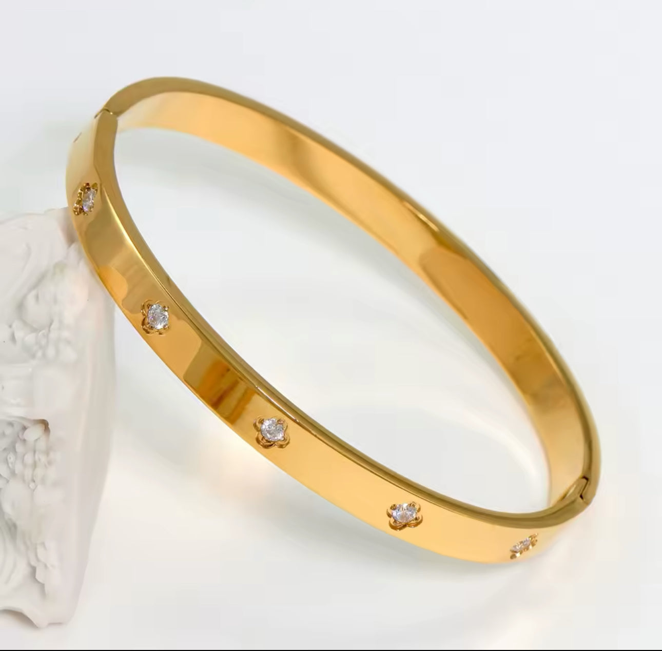 Luck meets luxury in the most elegant way! The Diamond Clover Bangle is here to bring you glamorous good fortune, featuring a sleek 18K gold-plated design, studded with delicate diamond-styled clover accents for that extra sparkle. Whether you believe in luck or just have impeccable taste, this beauty is a must-have.