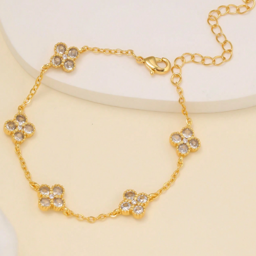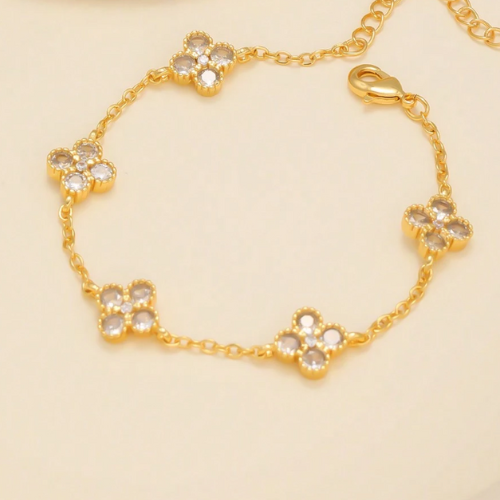 Good fortune never looked this fabulous! The Diamond Clover Bracelet is the perfect mix of elegance and everyday luxury, featuring shimmering diamond-styled clover charms delicately linked together on an 18K gold-plated chain. With its adjustable fit, this beauty is made for stacking, styling, and shining your way through life.