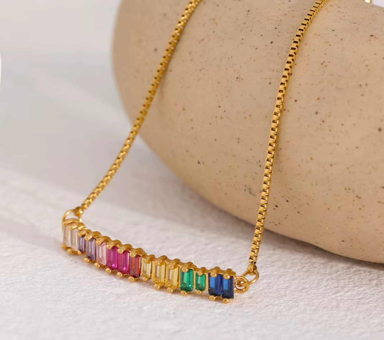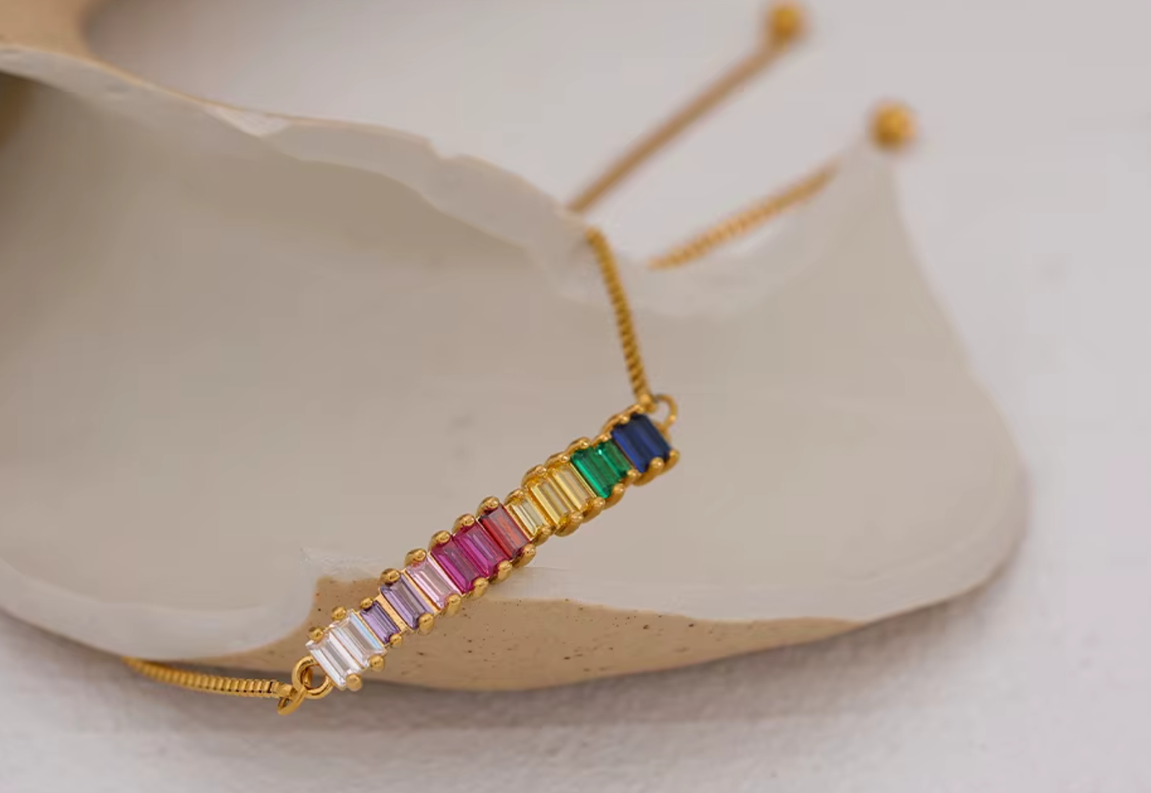Finished in 18K gold plating with a row of rainbow-toned stones and an adjustable slider fit, this bracelet is comfy, flattering, and dangerously easy to wear every single day.