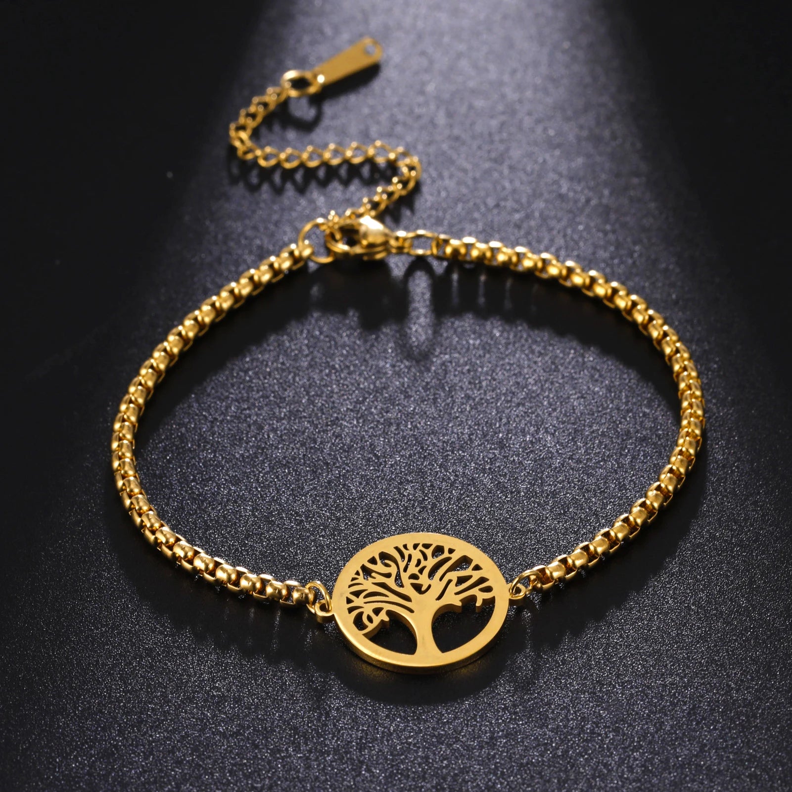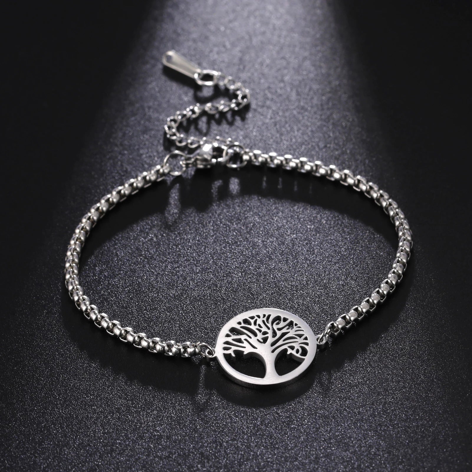 Crafted with utmost precision, these stainless steel bracelets feature a round pendant showcasing the enchanting tree of life at its center.