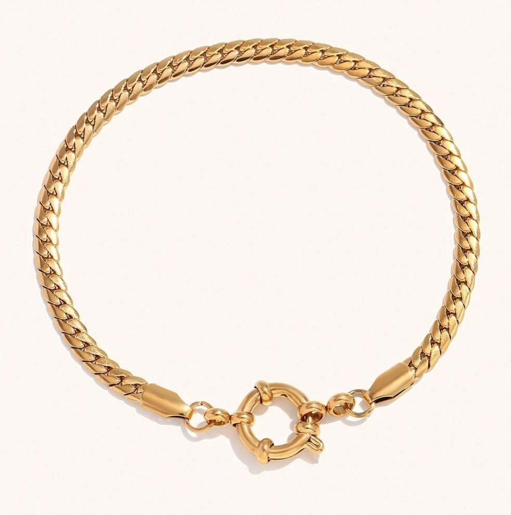 Step up your wrist game with The Curb Chain Charm Bracelet. Crafted with luxurious 18K gold plating, this beauty features a classic curb chain design that’s all about bold elegance. With its sleek, interlocked links and flawless finish, it brings just the right amount of statement to your everyday style.