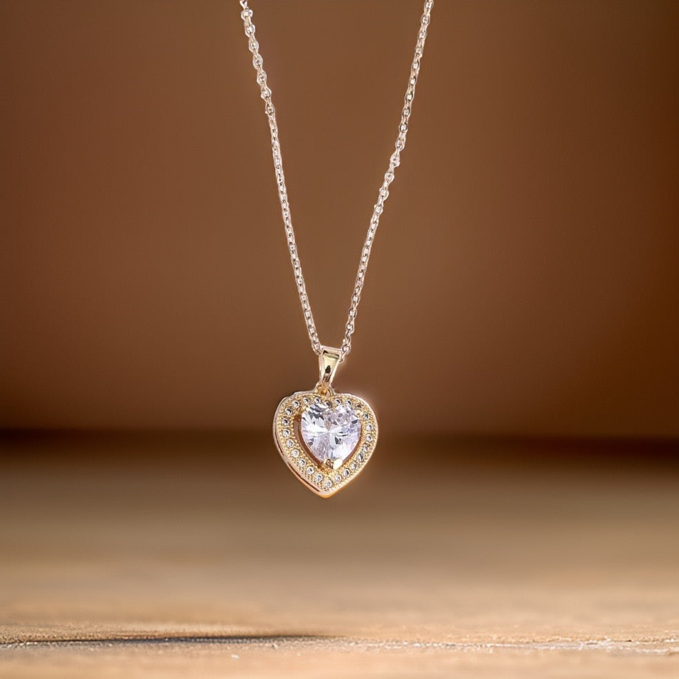 Crafted from high-quality gold stainless steel, this necklace features a sparkling cental heart-shaped diamond stone surrounded by shimmering crystals.