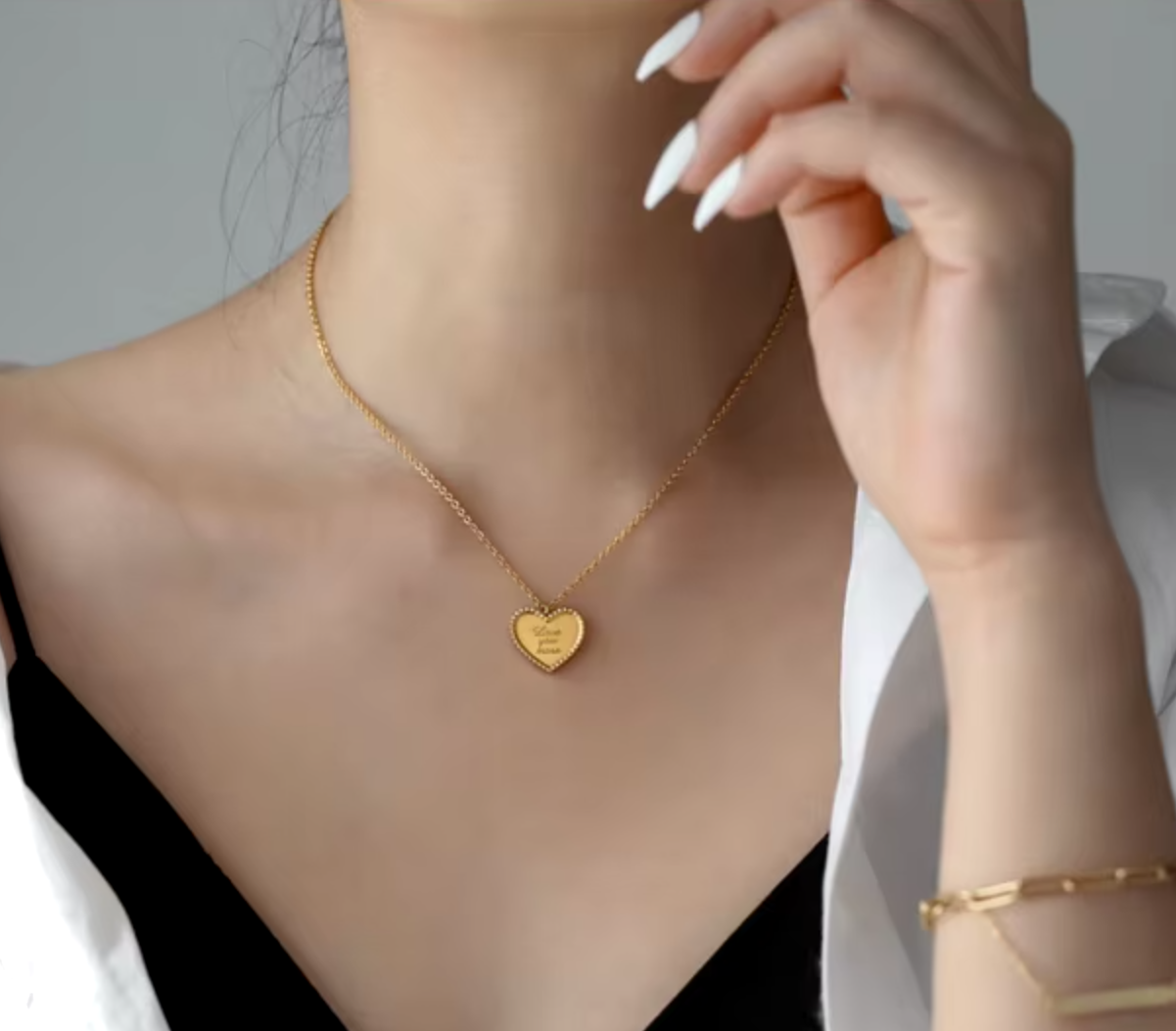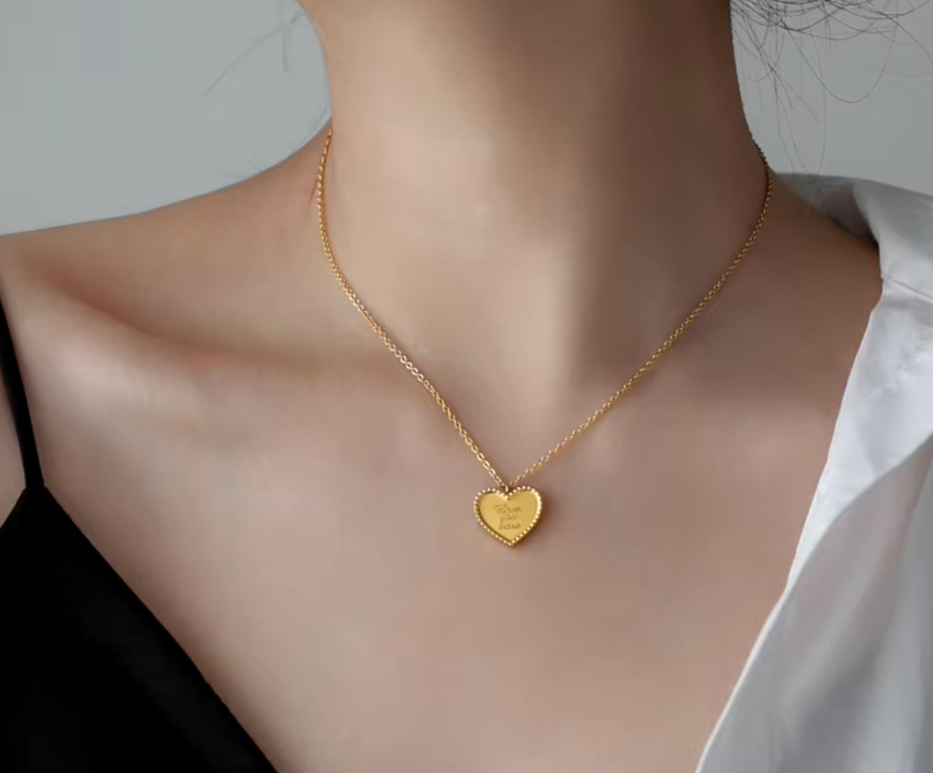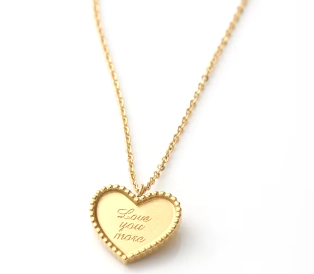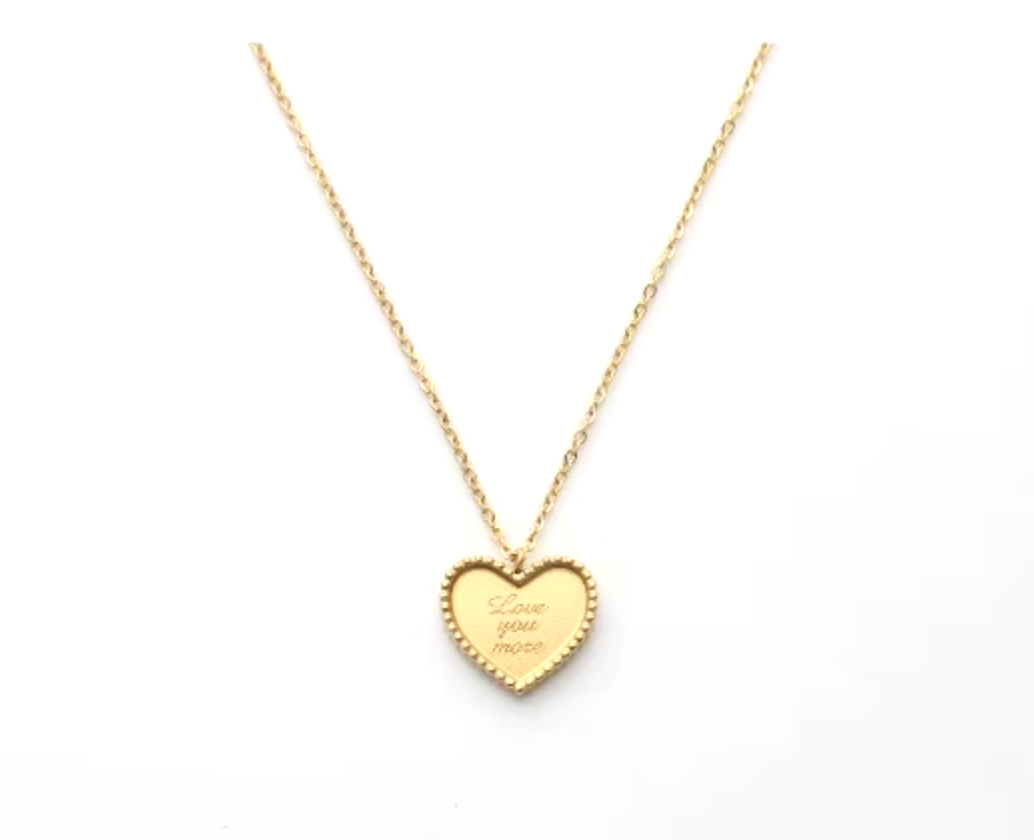 Featuring a sleek stainless steel chain and a chic heart pendant engraved with the words "Love you more," this necklace is a playful way to show that your affection knows no bounds.