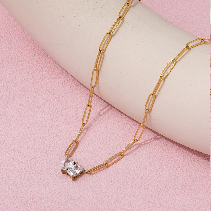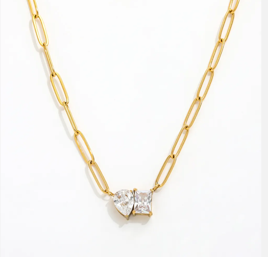 This neck candy is not your average accessory; it's an 18k gold-plated paperclip chain with a sassy triangle pendant bedazzled with two zircon diamonds. Need we say more?
