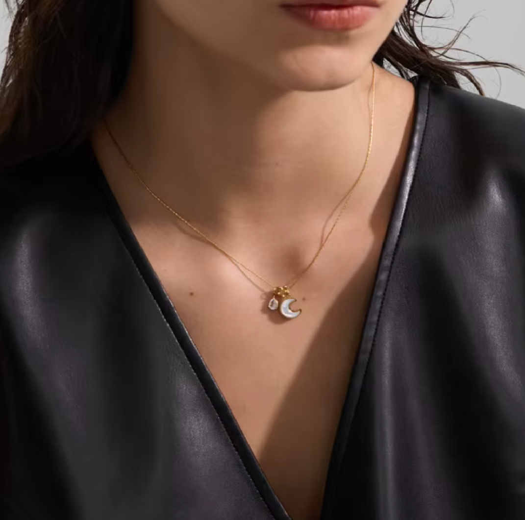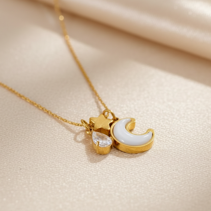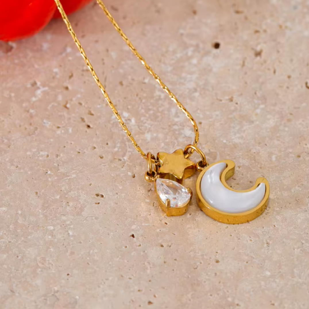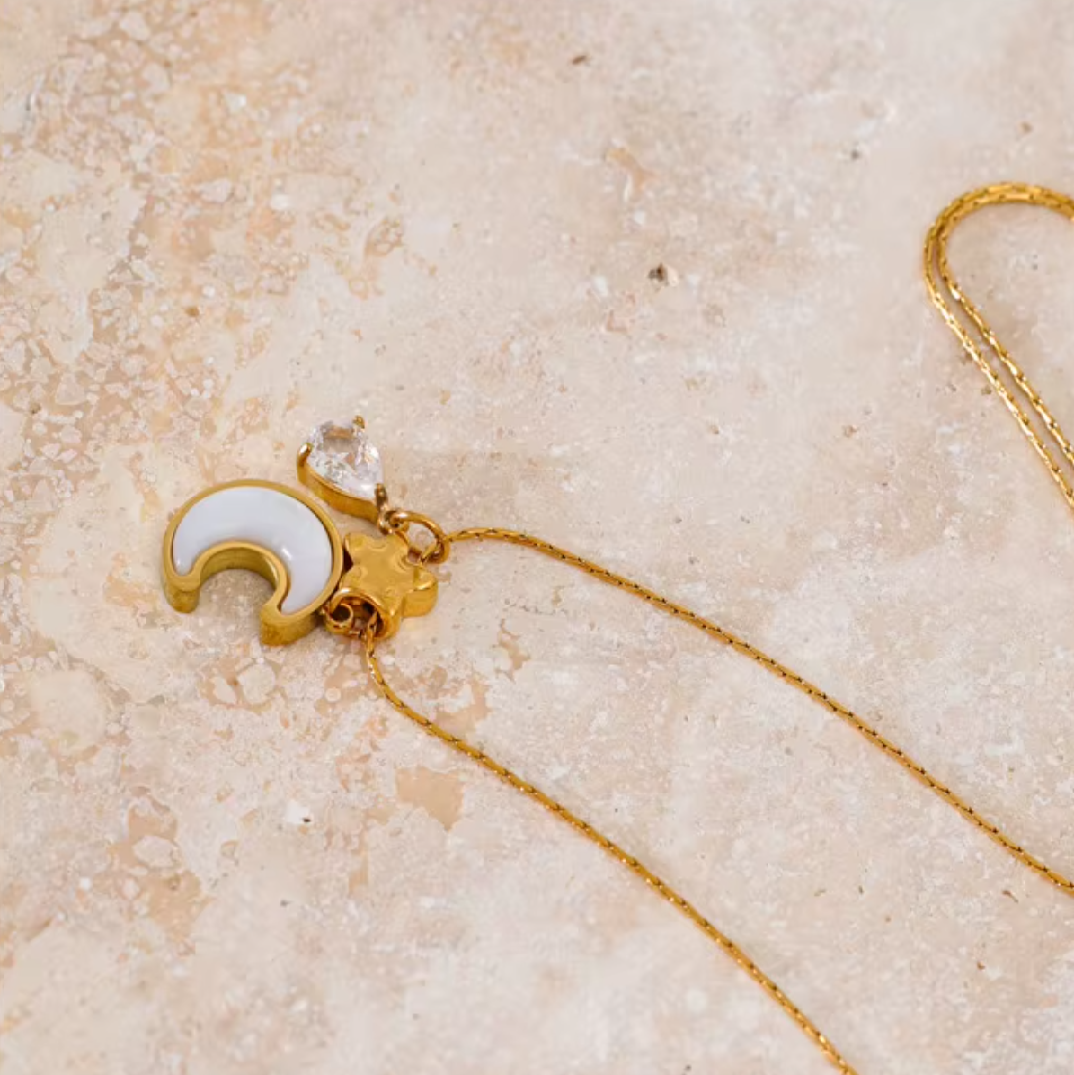 The Luna Charm Necklace features a sweet mix of celestial charms, including a moon, star, and crystal drop, It’s lightweight, easy to wear, and perfect for adding a subtle celestial touch to your everyday look.