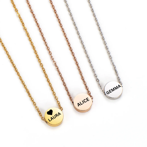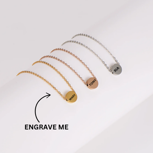 This 18K gold-plated beauty is designed to be your everyday staple, featuring a sleek, round pendant that’s ready to be engraved with your name, initials, or a special message. Whether it’s a gift for yourself or a loved one, this custom necklace is a sentimental treasure that never goes out of style.