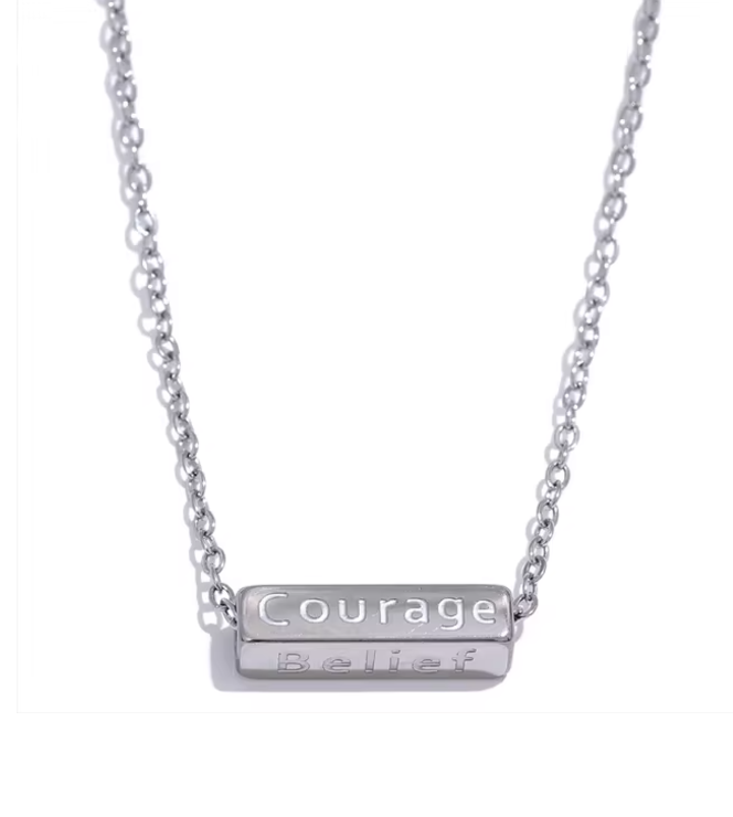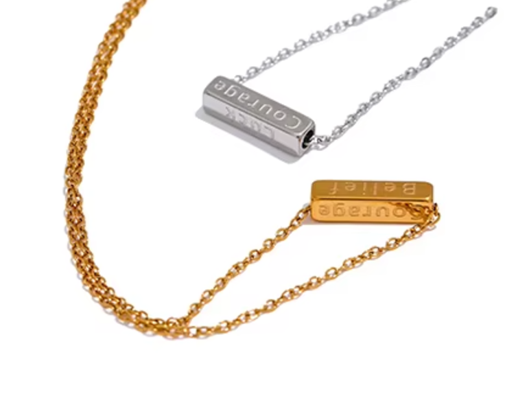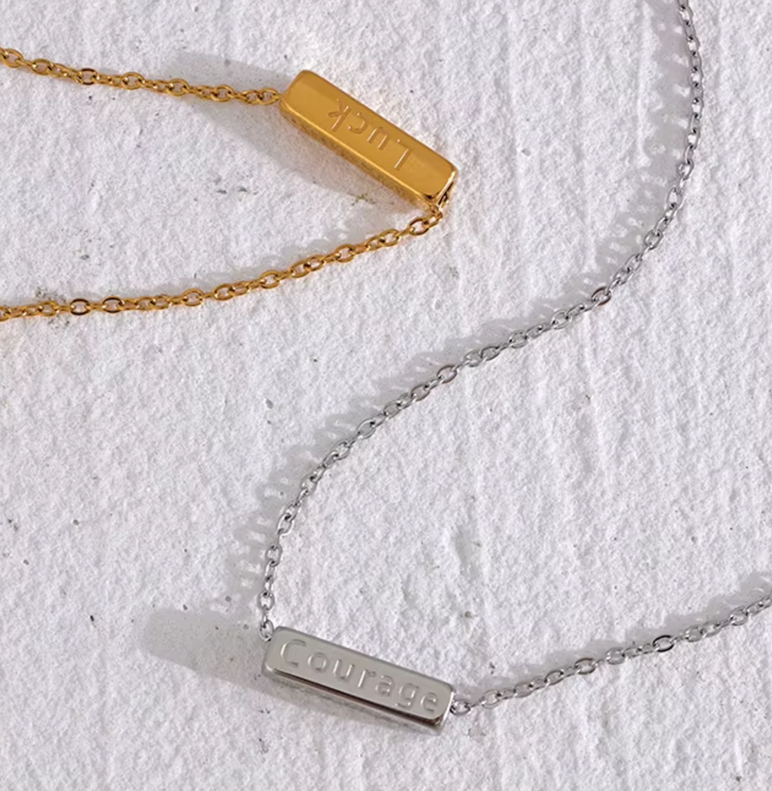 Each side of the minimalist rectangular bar pendant is engraved with empowering words: "believe," "luck," "wisdom," and "courage," serving as daily affirmations for strength and resilience.