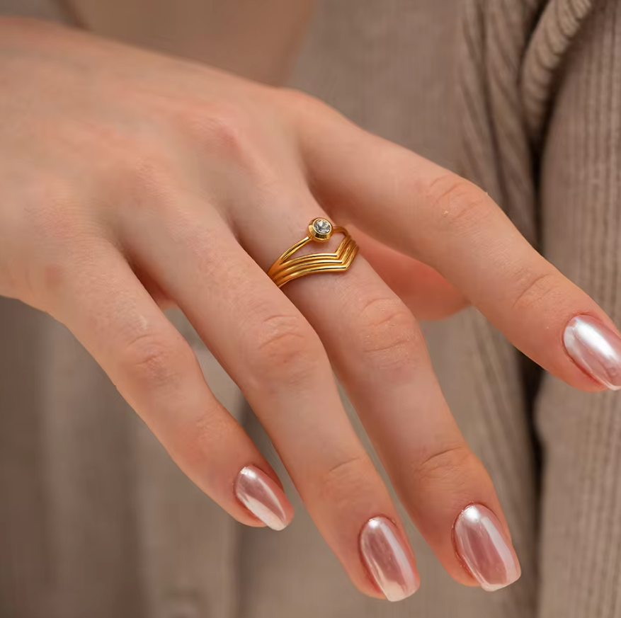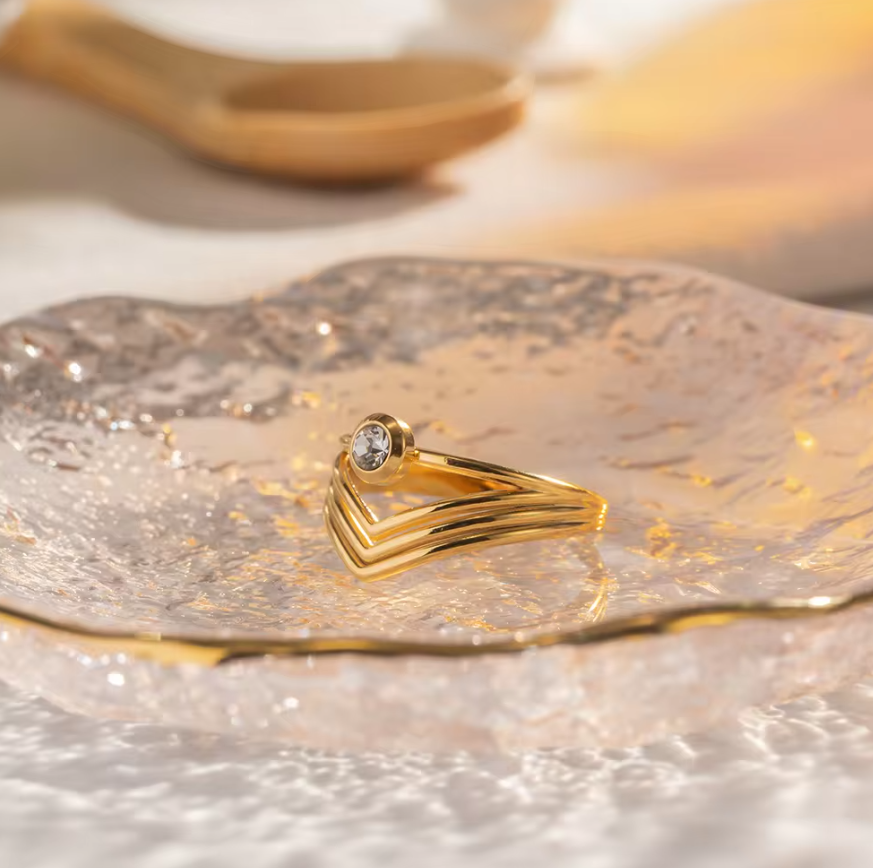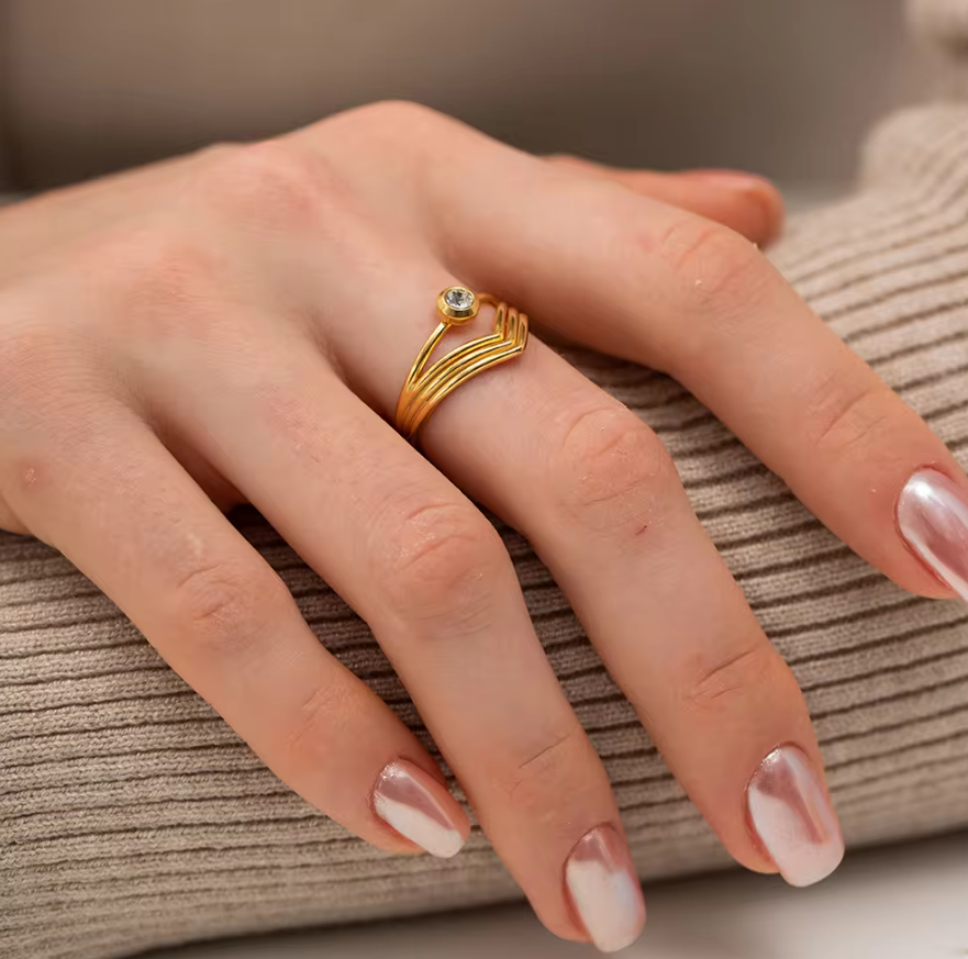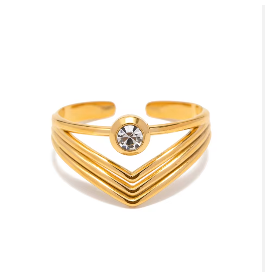 Crafted with 18K gold plating, this ring features a chevron-style front adorned with a dazzling round zircon stone on the top band. The adjustable size ensures a perfect fit for any finger, while the waterproof and non-tarnish design guarantees long-lasting beauty.