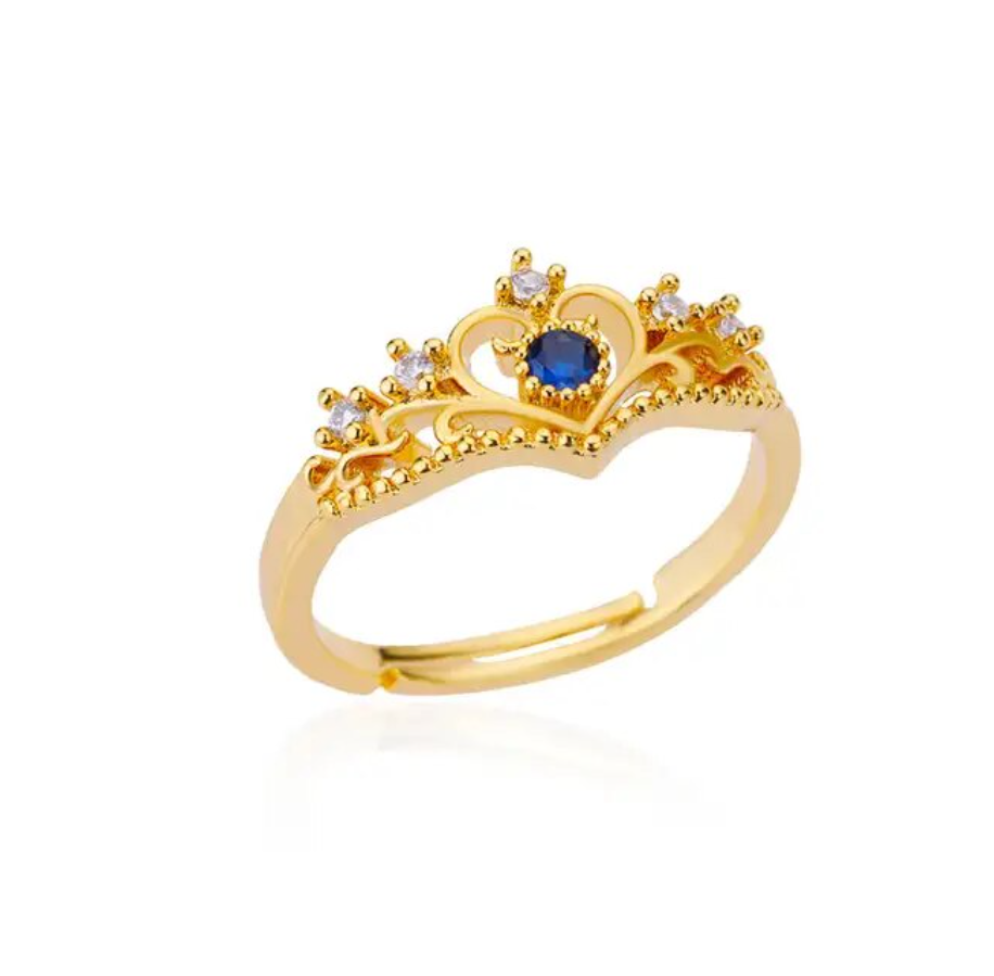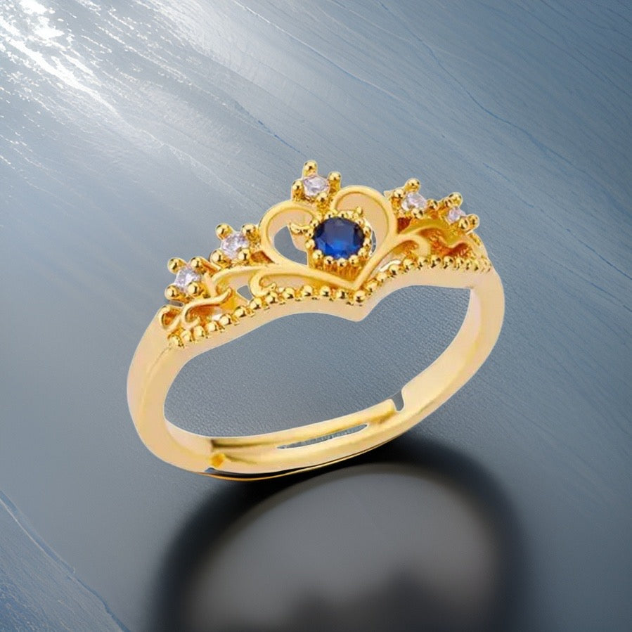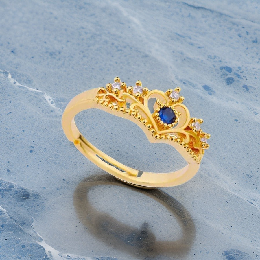Crafted from stainless steel, this adjustable ring showcases a stunning tiara design at its front. Glittering little crystals adorn the tiara, while a captivating blue stone takes center stage.