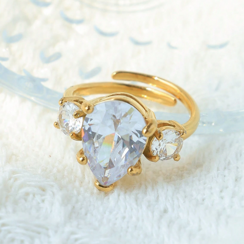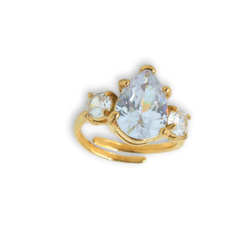 A ring fit for a queen—The Anastasia Ring is all about bold elegance with a touch of fairytale magic. Featuring a brilliant pear-cut center stone, flanked by two dazzling side gems, this beauty is set on a luxurious 18K gold-plated adjustable band for a perfect, custom-like fit. Whether you're ruling your empire or making a statement on a night out, this ring is here to steal the spotlight.