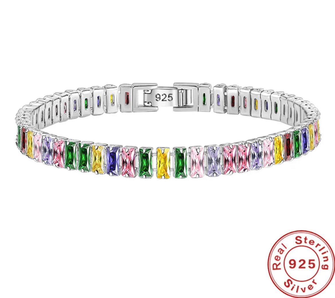 Made of 925 sterling silver, this bracelet is both beautiful and durable. The 18cm length is perfect for everyday wear, and the stunning high quality multicoloured baguette stones make it a real standout.
