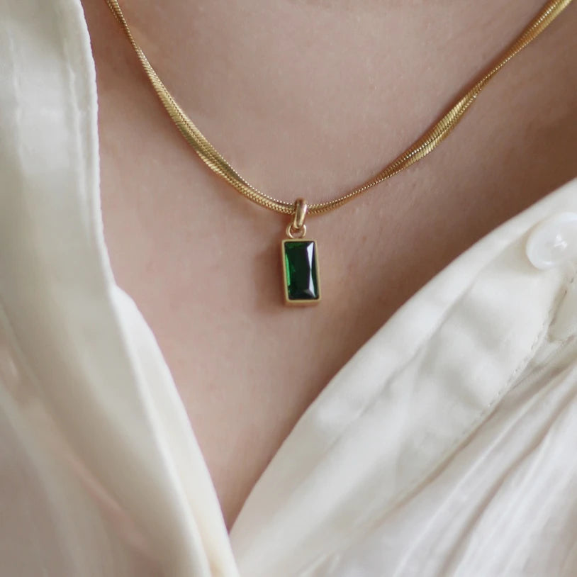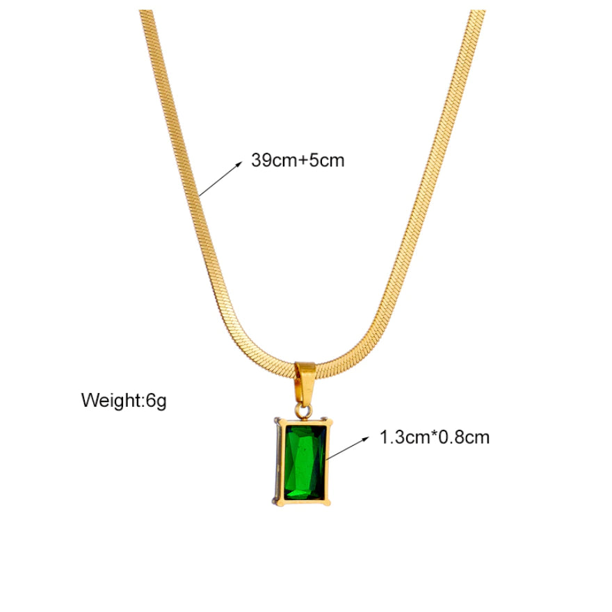The pendant is made from high quality green zircon stone, in a rectangle shape with an adjustable length snake chain that can be used to fit any neck size.