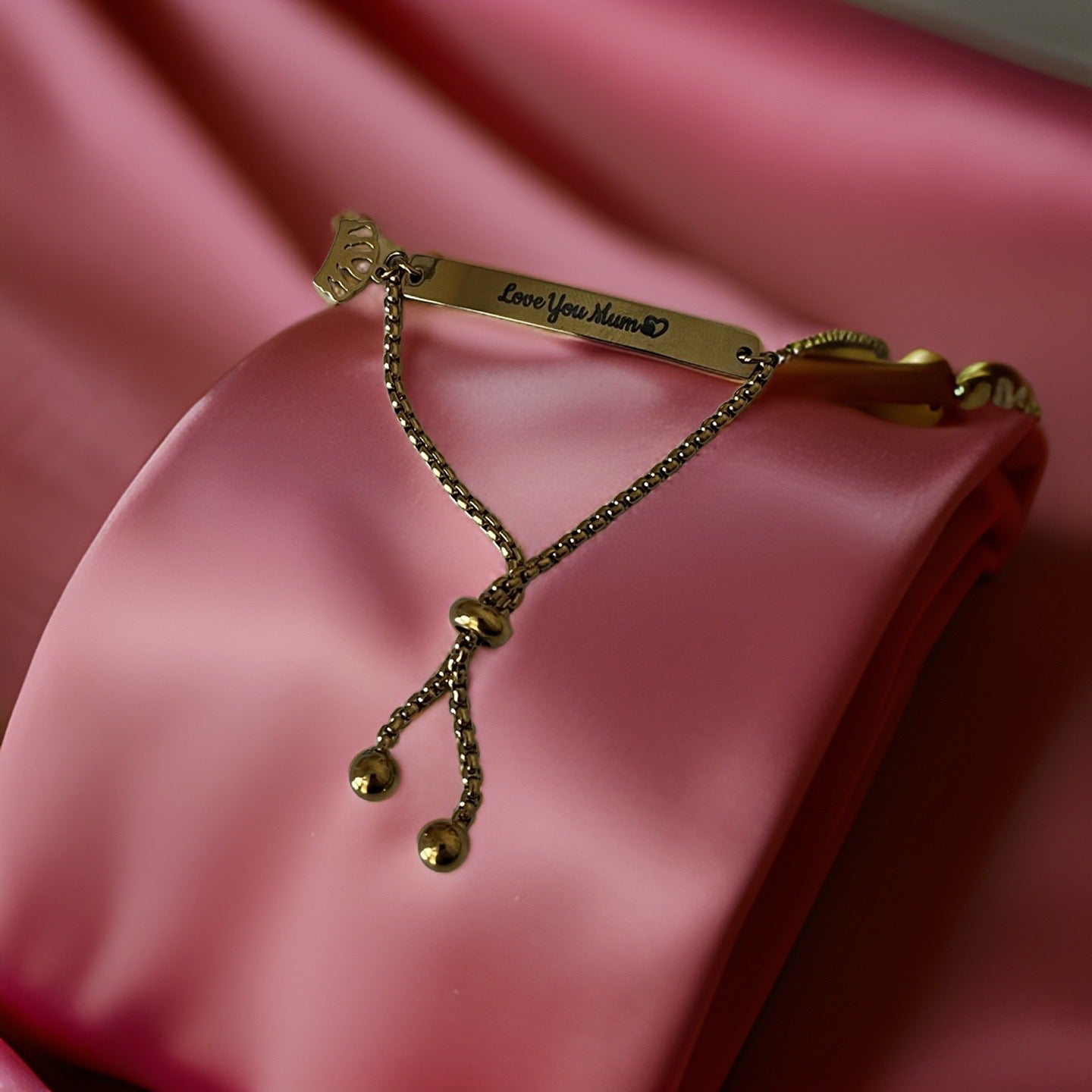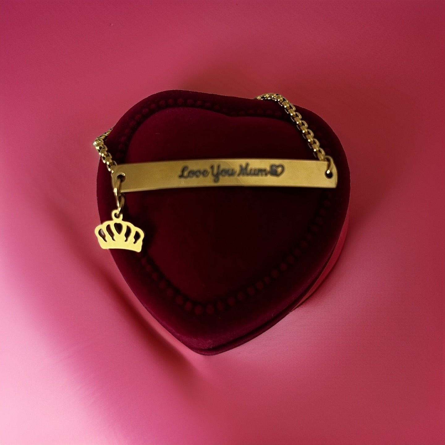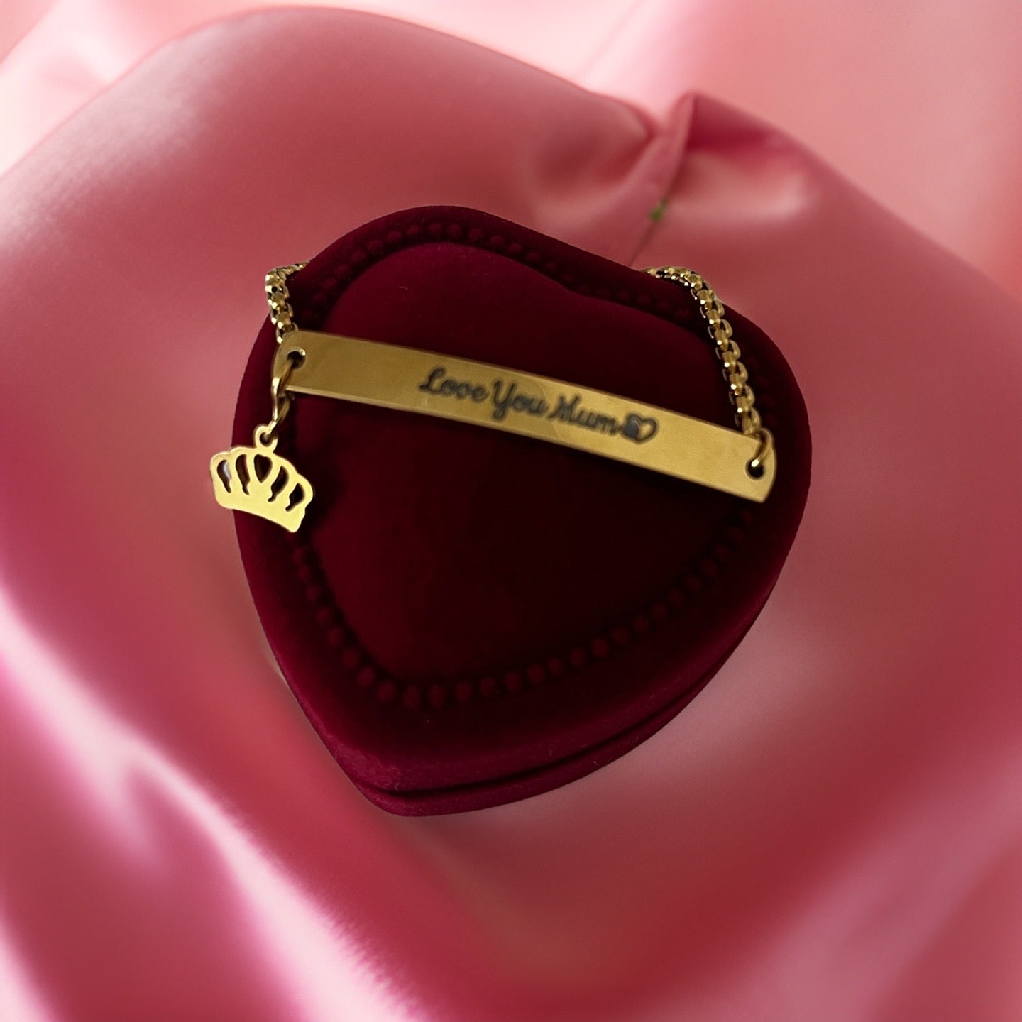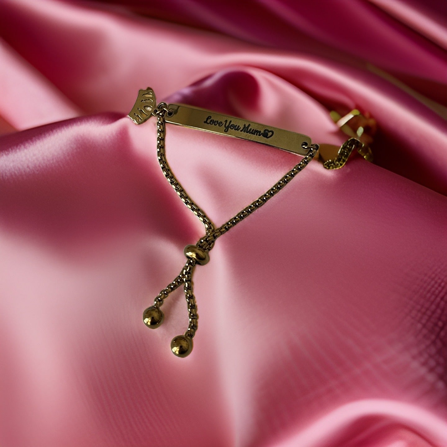 Crafted with exquisite attention to detail, these 18K gold plated bracelets feature a slider chain for a customizable fit. The front of the bracelet proudly displays the heartfelt inscription "Love you Mum," while a cute crown charm adorns the side, symbolizing her regal presence in your life.