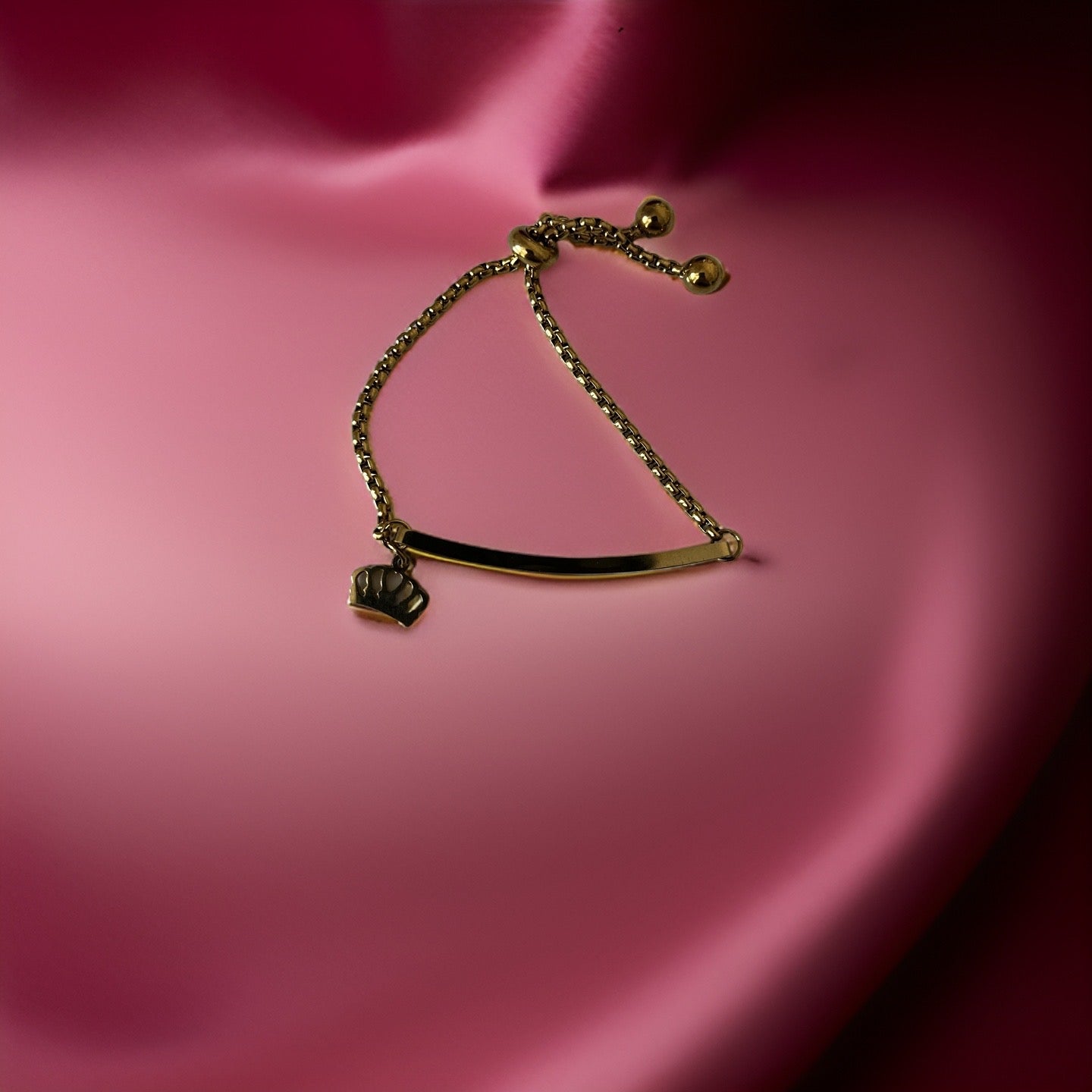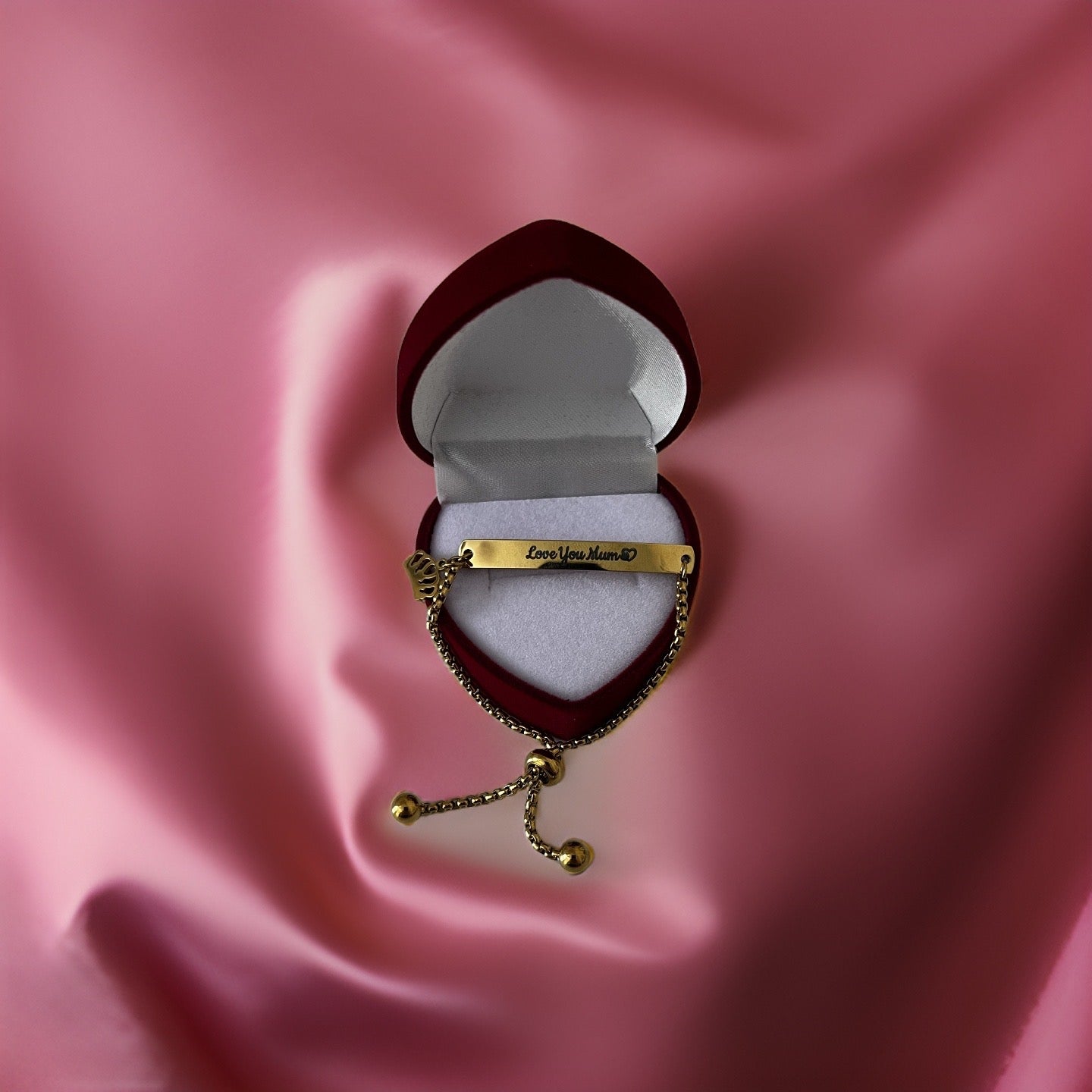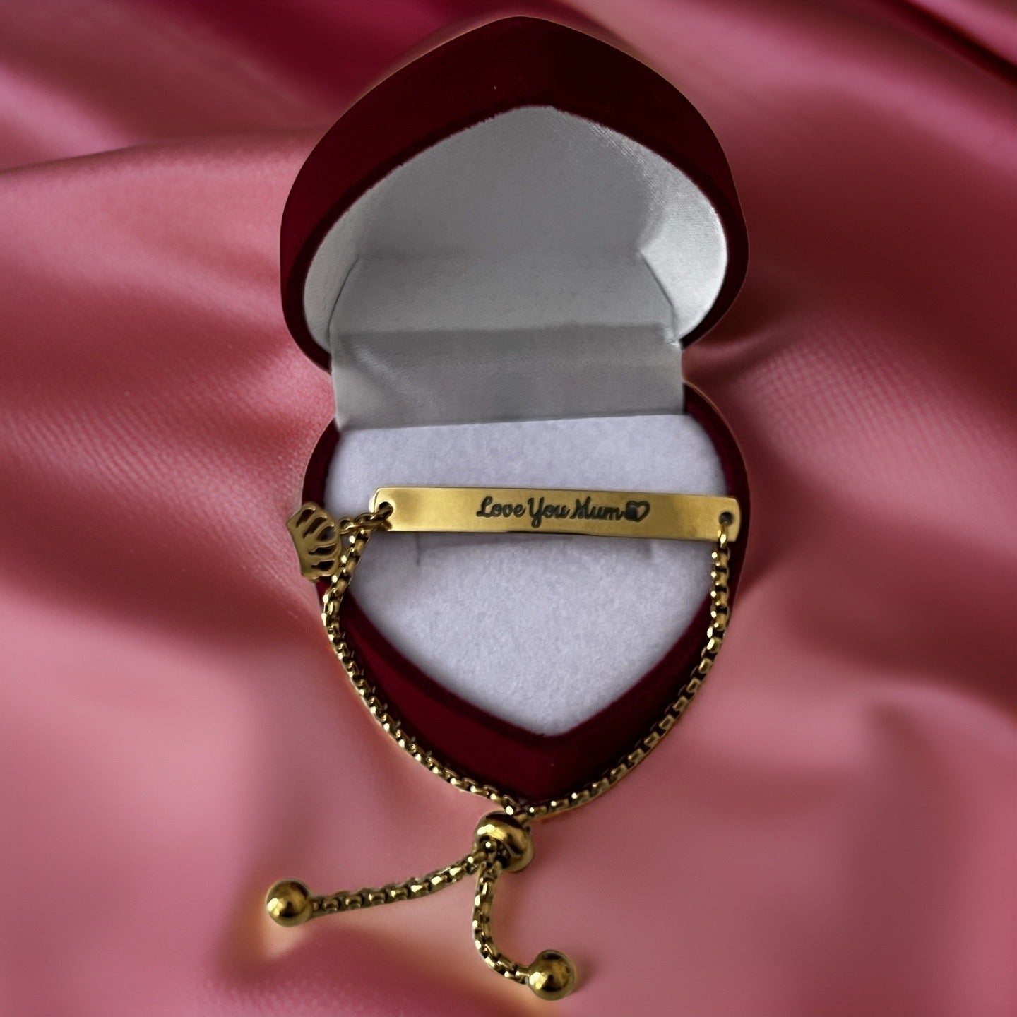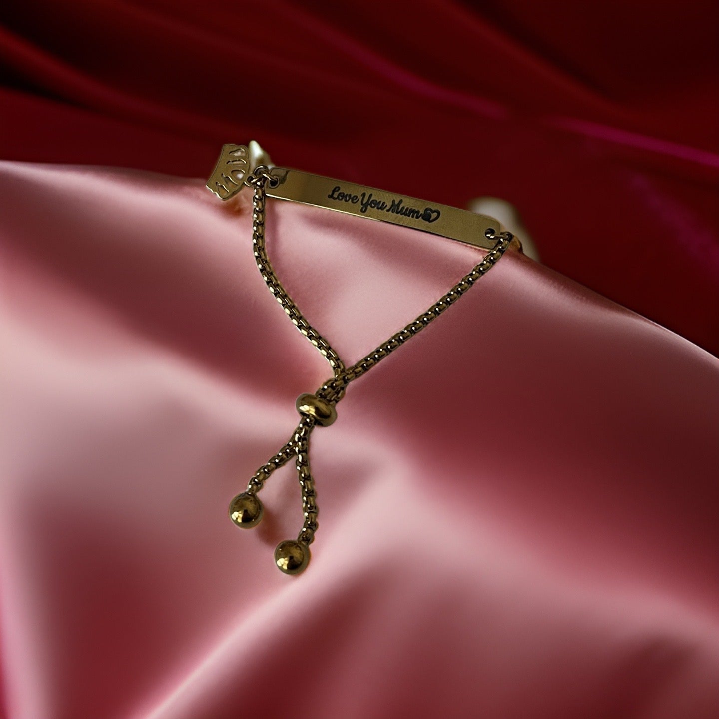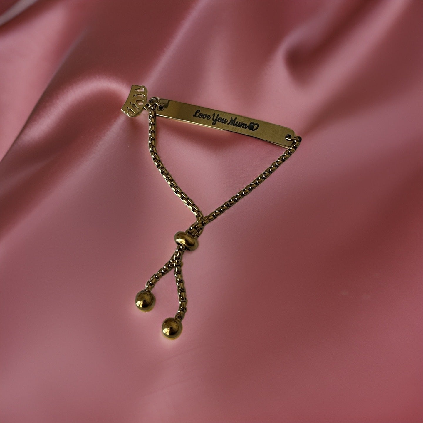 Crafted with exquisite attention to detail, these 18K gold plated bracelets feature a slider chain for a customizable fit. The front of the bracelet proudly displays the heartfelt inscription "Love you Mum," while a cute crown charm adorns the side, symbolizing her regal presence in your life.