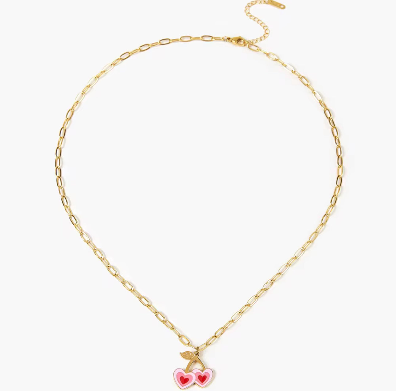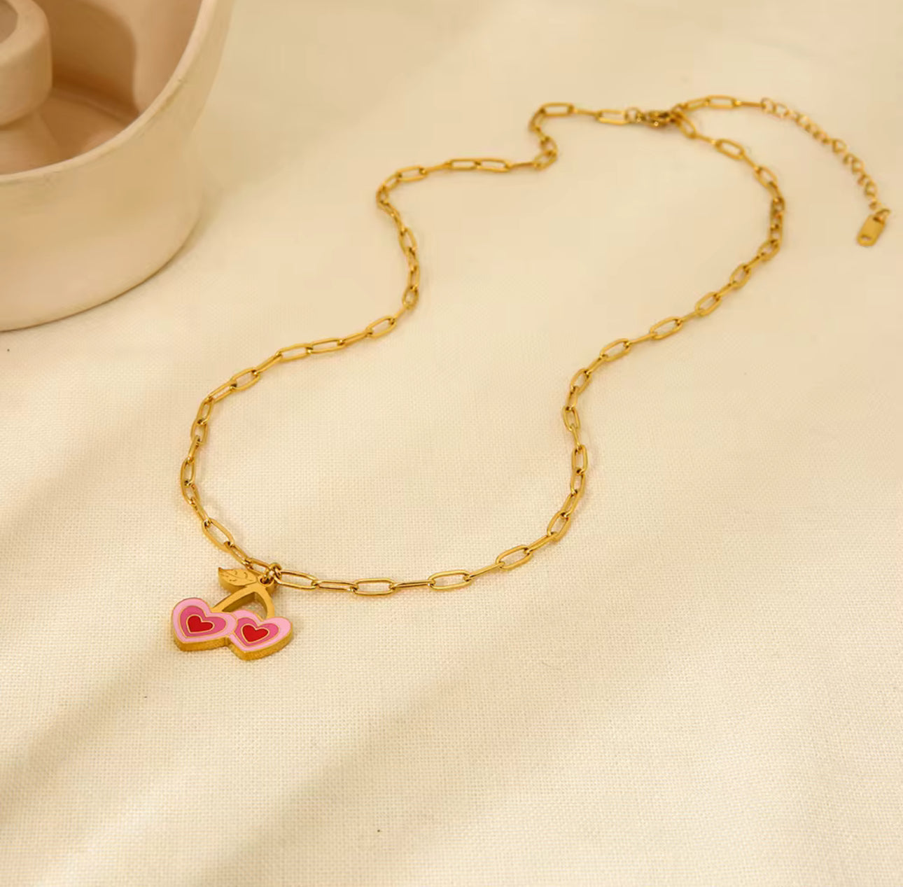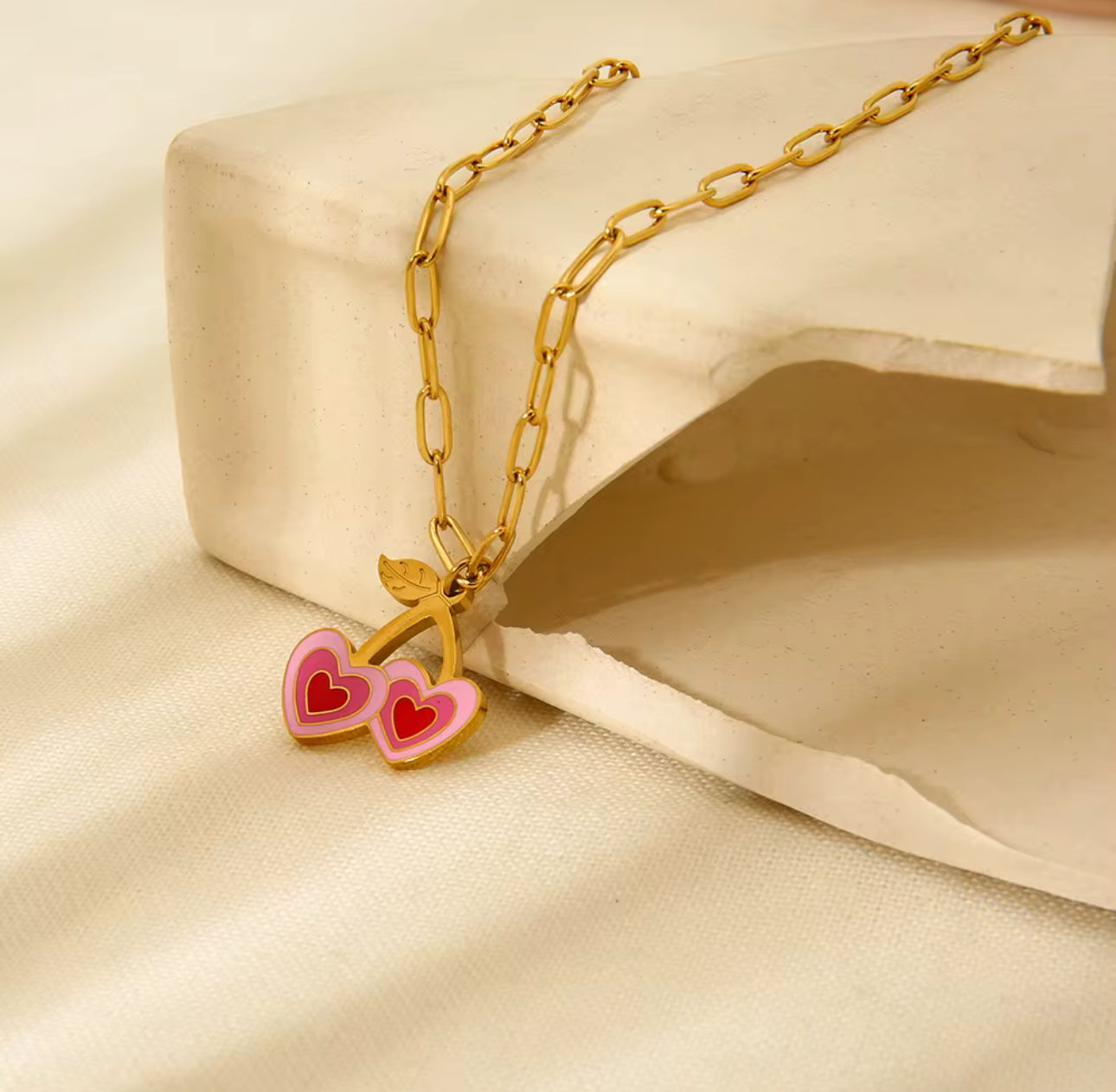 Made with 18K gold plated stainless steel, this necklace features stunning pink heart-shaped cherries in various shades of pink.