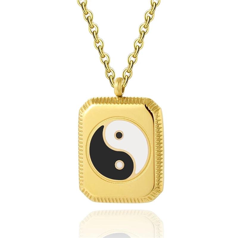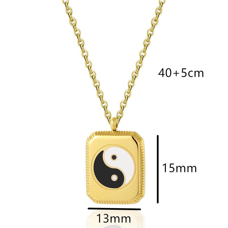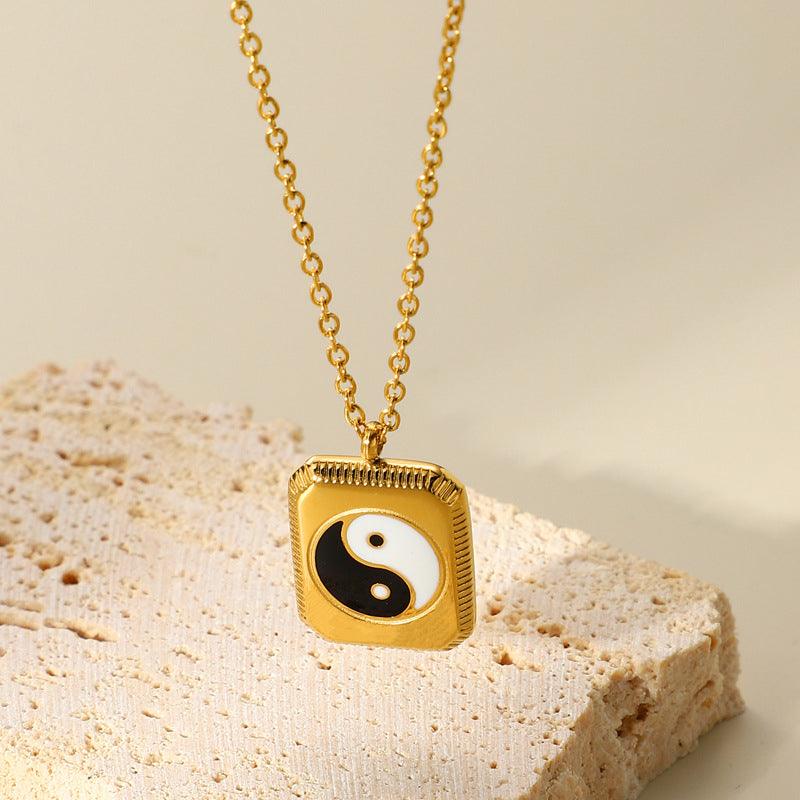Crafted from stainless steel, this necklace features a square pendant with a Ying Yang symbol, coated in a luxurious gold finish.