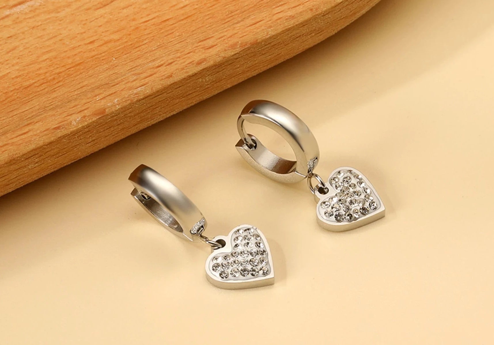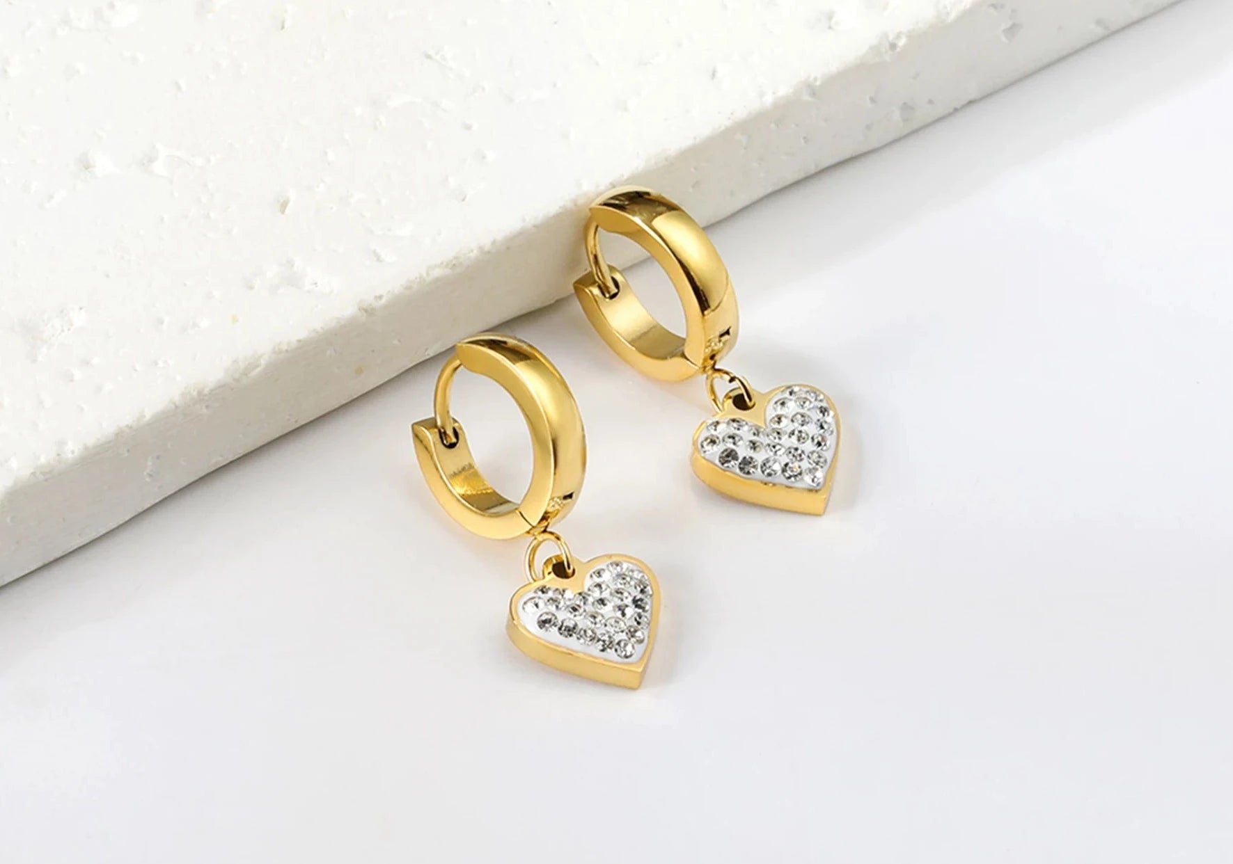 These 14k gold plated earrings feature a heart charm adorned with glittering crystals, adding a touch of glamour to your look. The hoop design adds a modern twist, making these earrings perfect for any occasion.