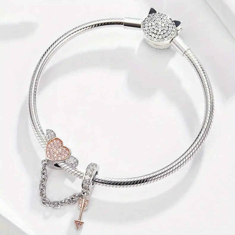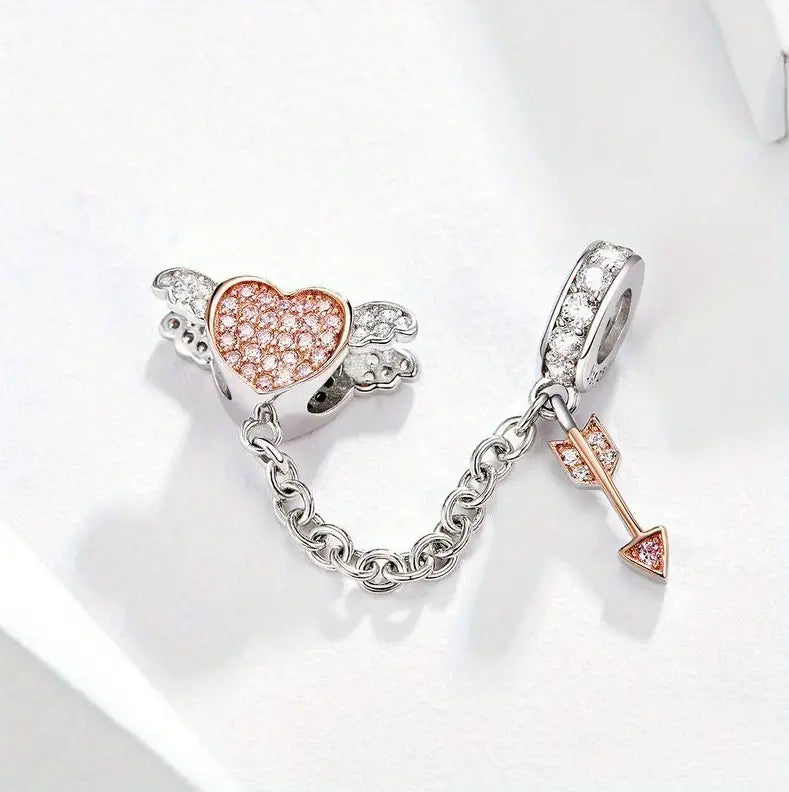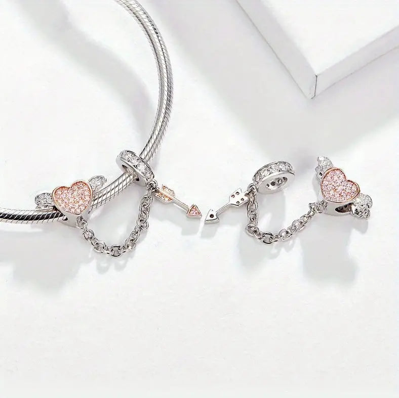 This beautiful charm takes the shape of a pink heart, adorned with sparkling crystals and delicate wings on either side. The bracelet also features a unique drop-down chain, complete with an arrow, adding an extra touch of enchantment.
