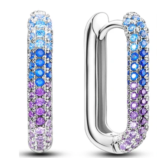 Crafted with utmost precision, these 925 sterling silver earrings boast a unique U-shaped hoop design adorned with mesmerizing multicolored purple and blue crystals. The vibrant hues of the crystals catch the light, adding a touch of elegance to any ensemble.