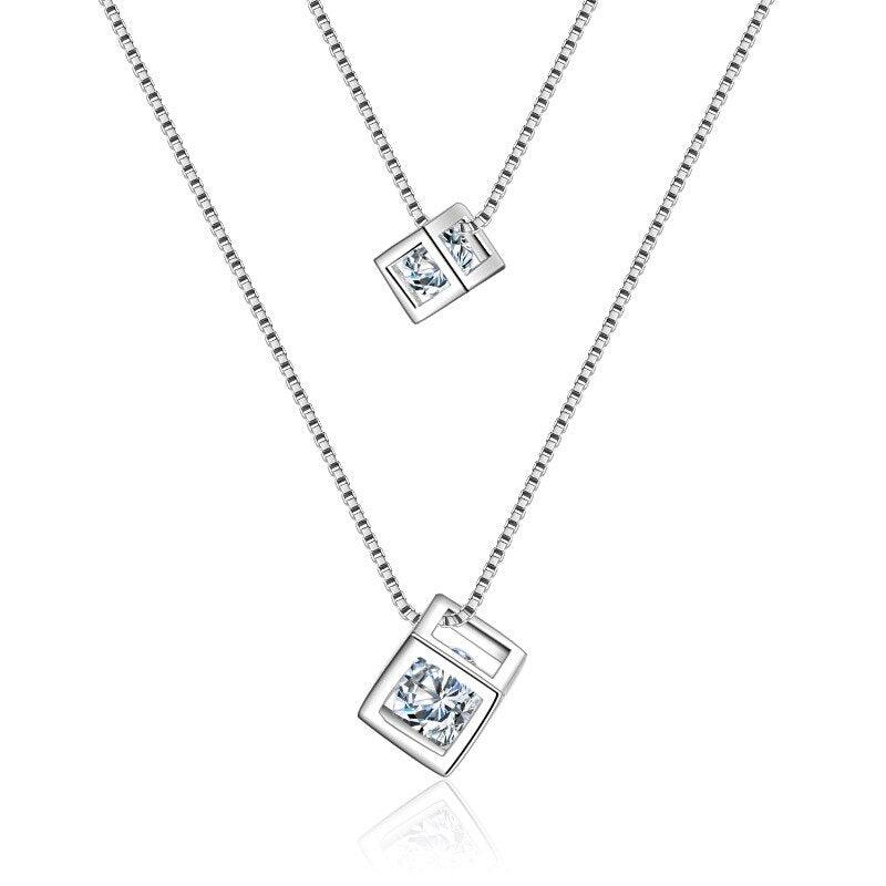 Crafted from 925 sterling silver, the necklace is adjustable in length, and features a double chain design with two hollow square frames that house a gorgeous diamond crystal in the middle.