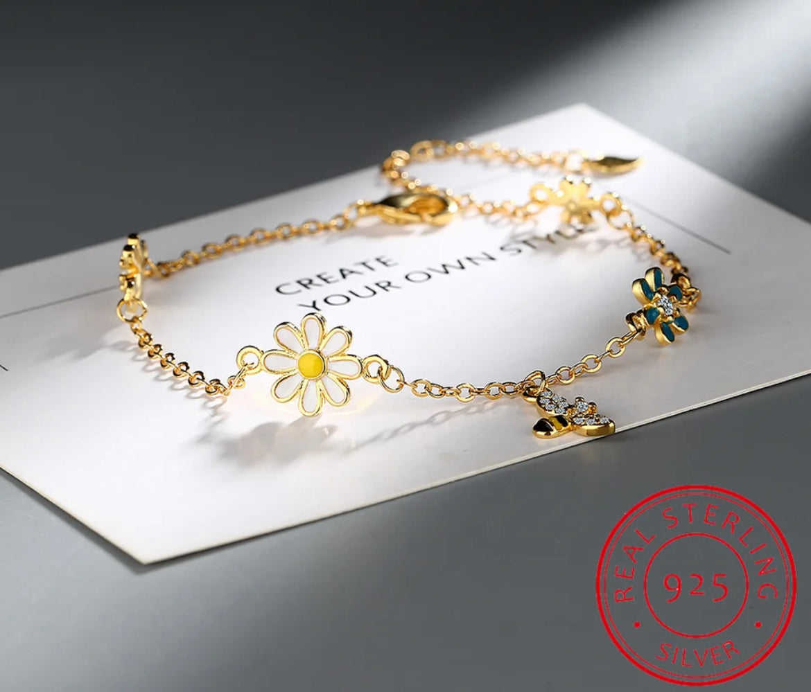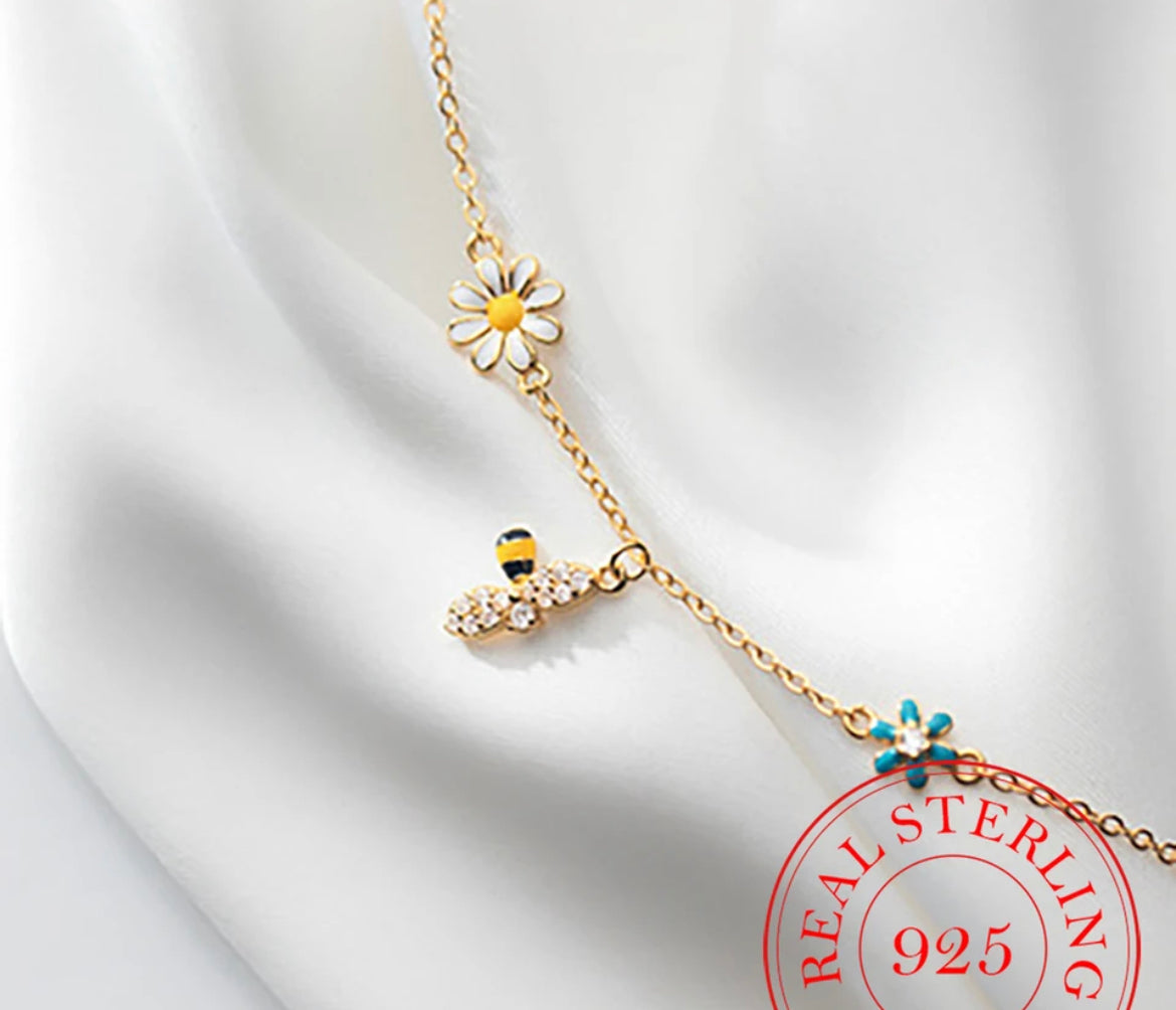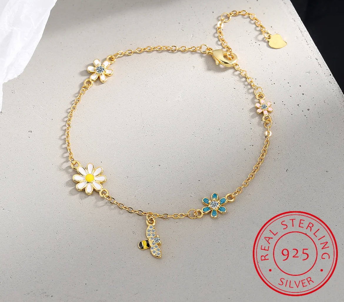 This beautiful piece is made of sterling silver and is adjustable to fit most wrists. It comes with a gorgeous bumble bee and flower charm that is sure to add some personality to your outfit.