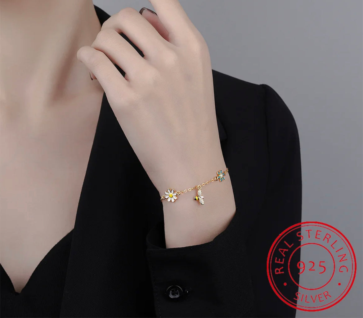 Gold Elena Bumble Bee Charm Bracelet / 925 Sterling Silver