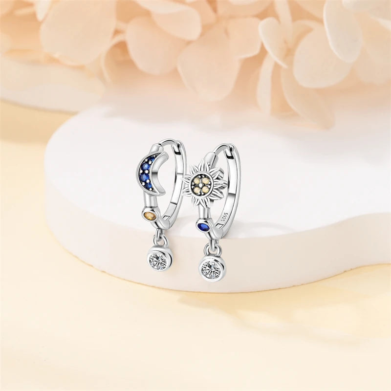 These little hoops showcase a sun on one hoop and a moon on the other, symbolizing the eternal dance of day and night. Each earring is adorned with a round zircon stone, adding a touch of sparkle and elegance.