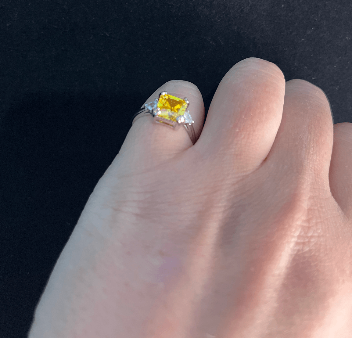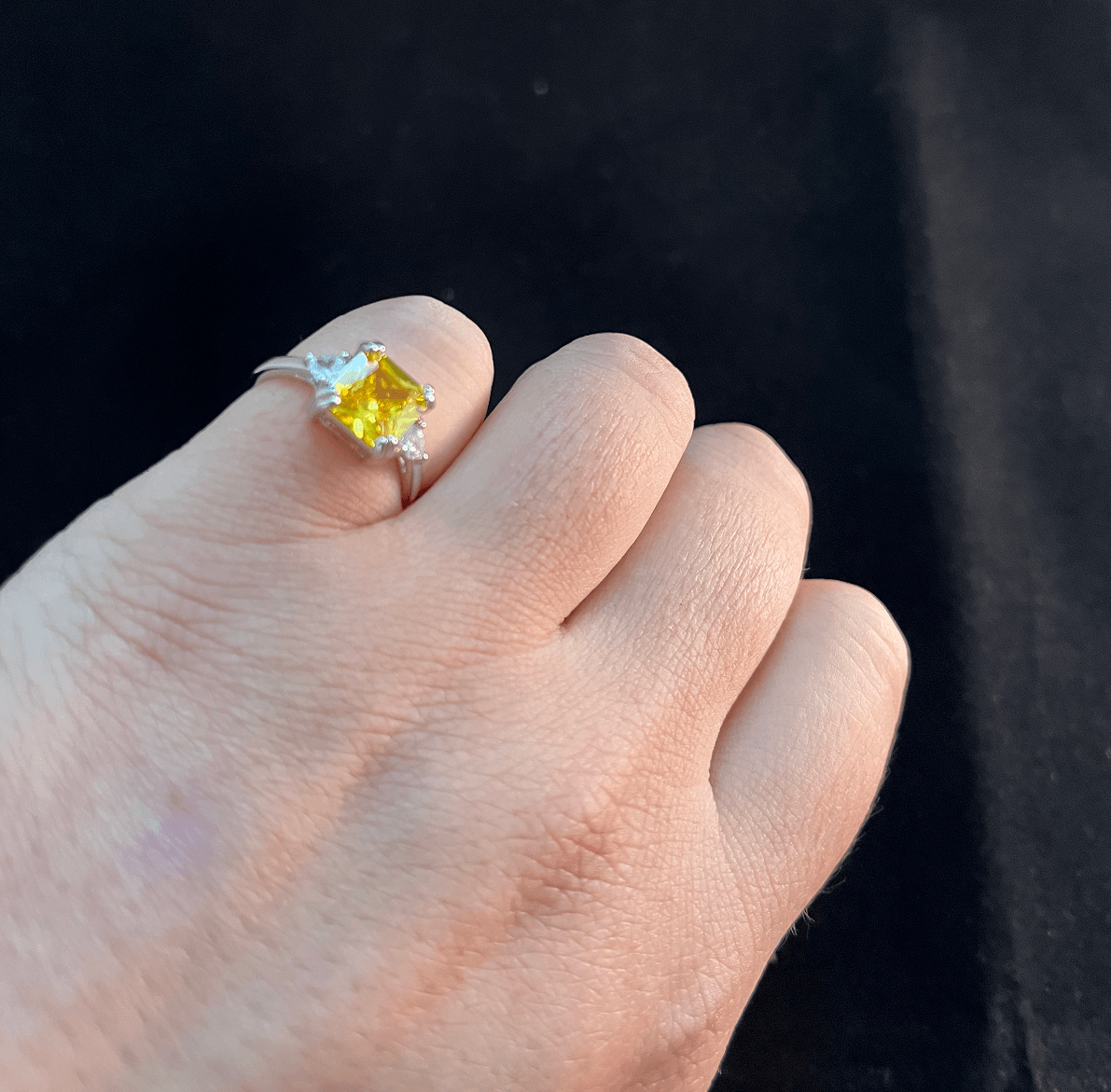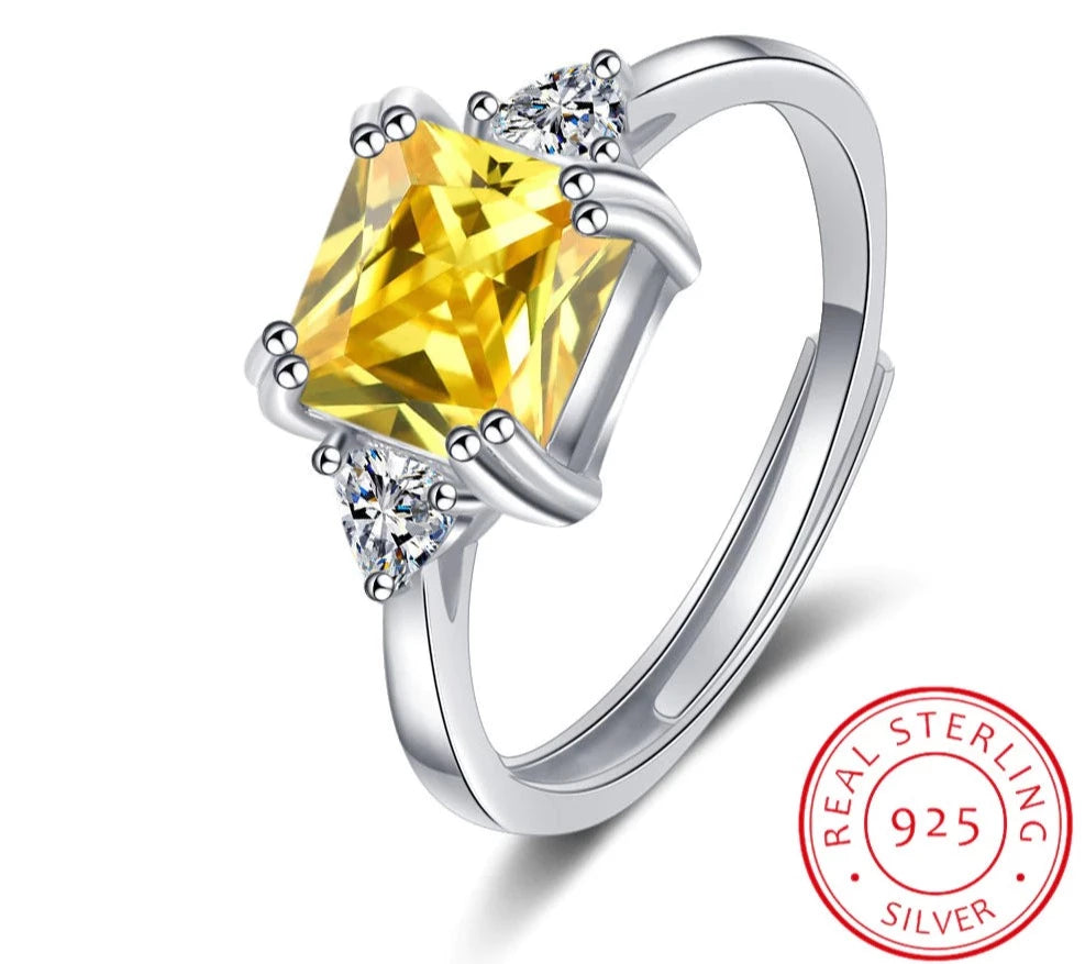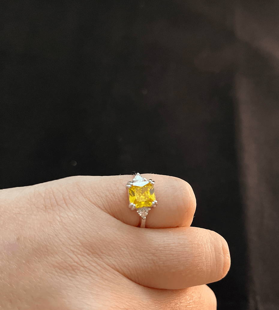This gorgeous ring is made of sterling silver and features an impressive yellow moissanite crystal stone, surrounded by beautiful glittering zircon stones on the sides of the band.