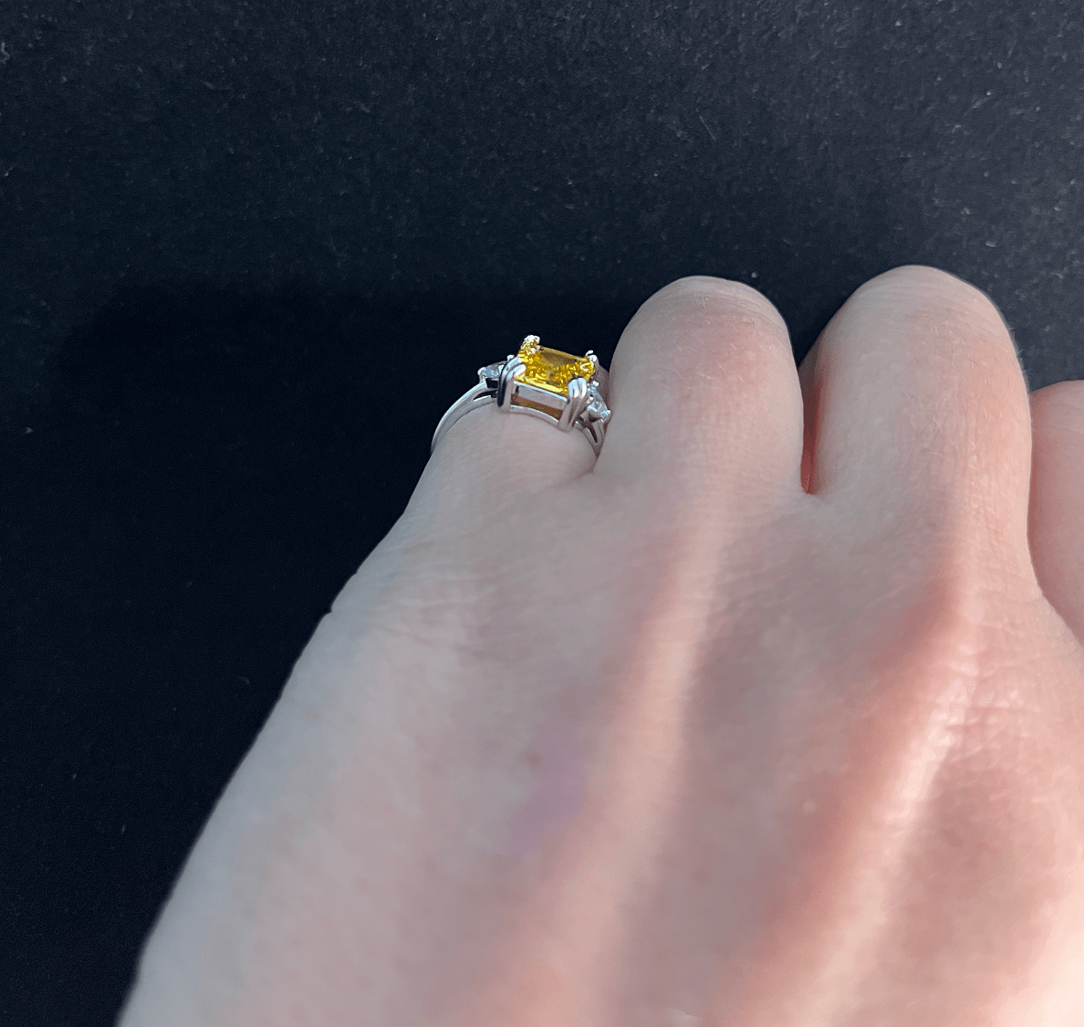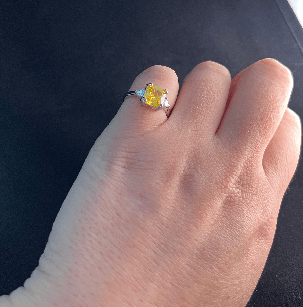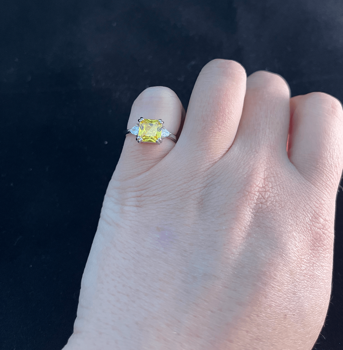 This gorgeous ring is made of sterling silver and features an impressive yellow moissanite crystal stone, surrounded by beautiful glittering zircon stones on the sides of the band.