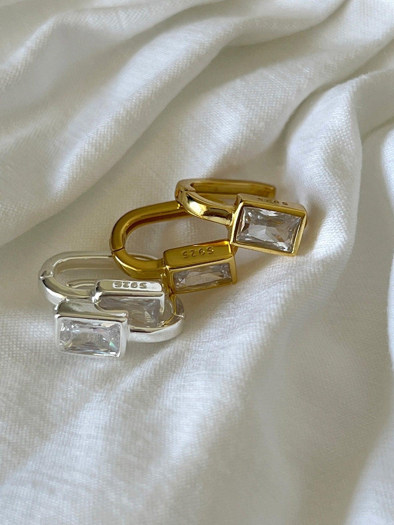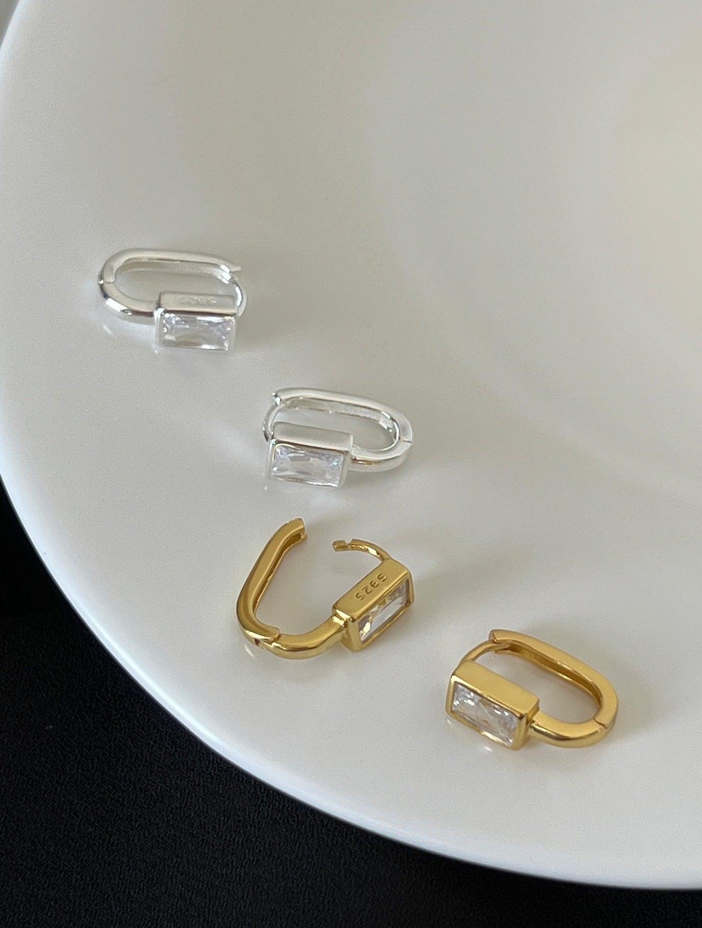 These luxurious earrings feature a stainless steel U-shaped huggie design and a high shine zircon diamond in the centre.