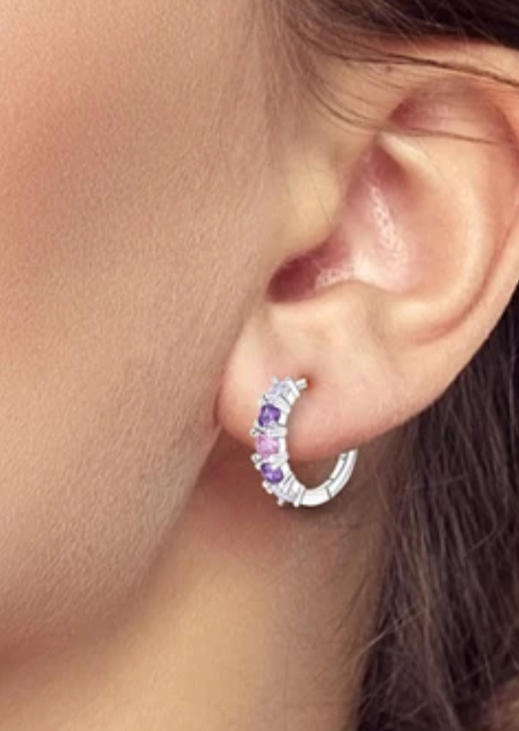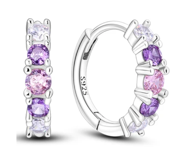 Crafted from 925 sterling silver, these hoop earrings are as durable as they are stunning. The front of each hoop is adorned with pink and purple glittering crystals, adding a pop of color and sparkle to any outfit.