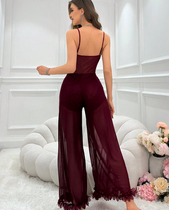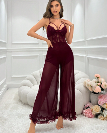 One-piece lace and mesh wide-leg jumpsuit