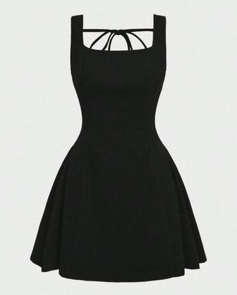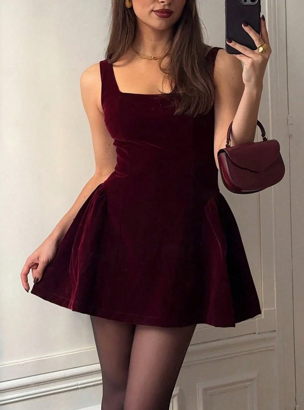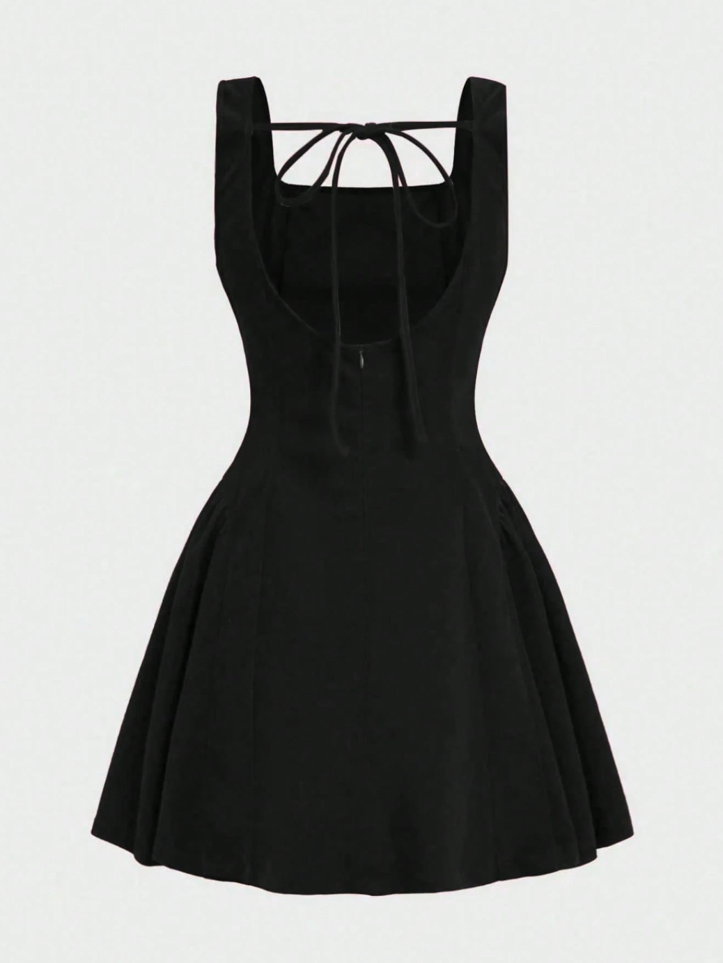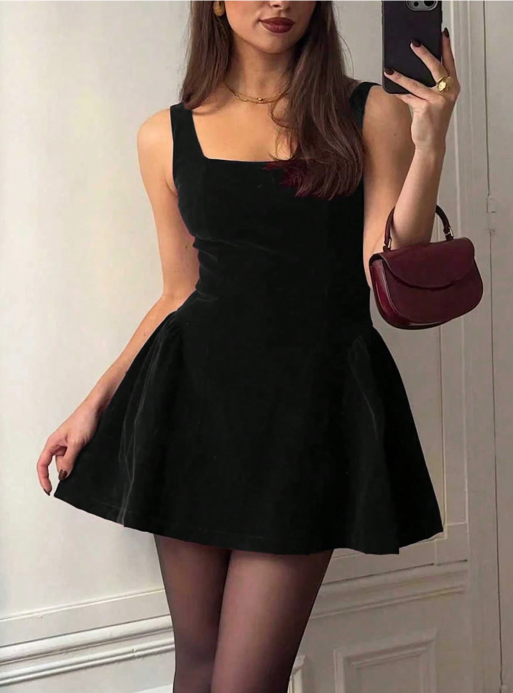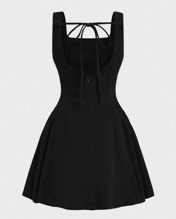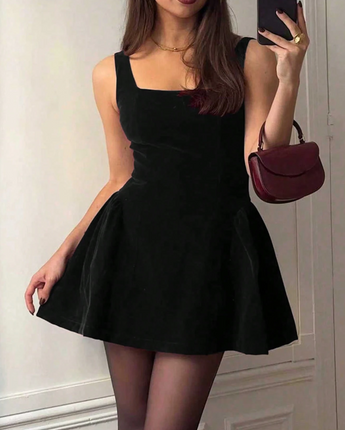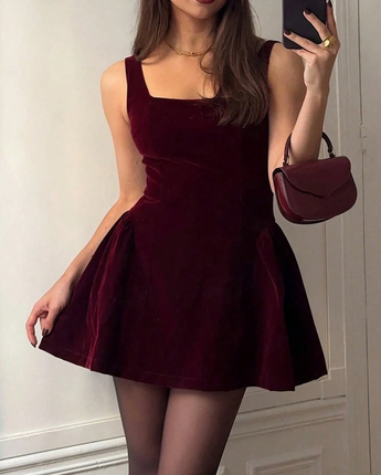 Made from soft velvet with a flattering square neckline and a flared mini skirt, she cinches the waist, skims the hips, and gives you that dreamy silhouette we’re all chasing. Then you turn around… and boom, the lace-up back steals the show.