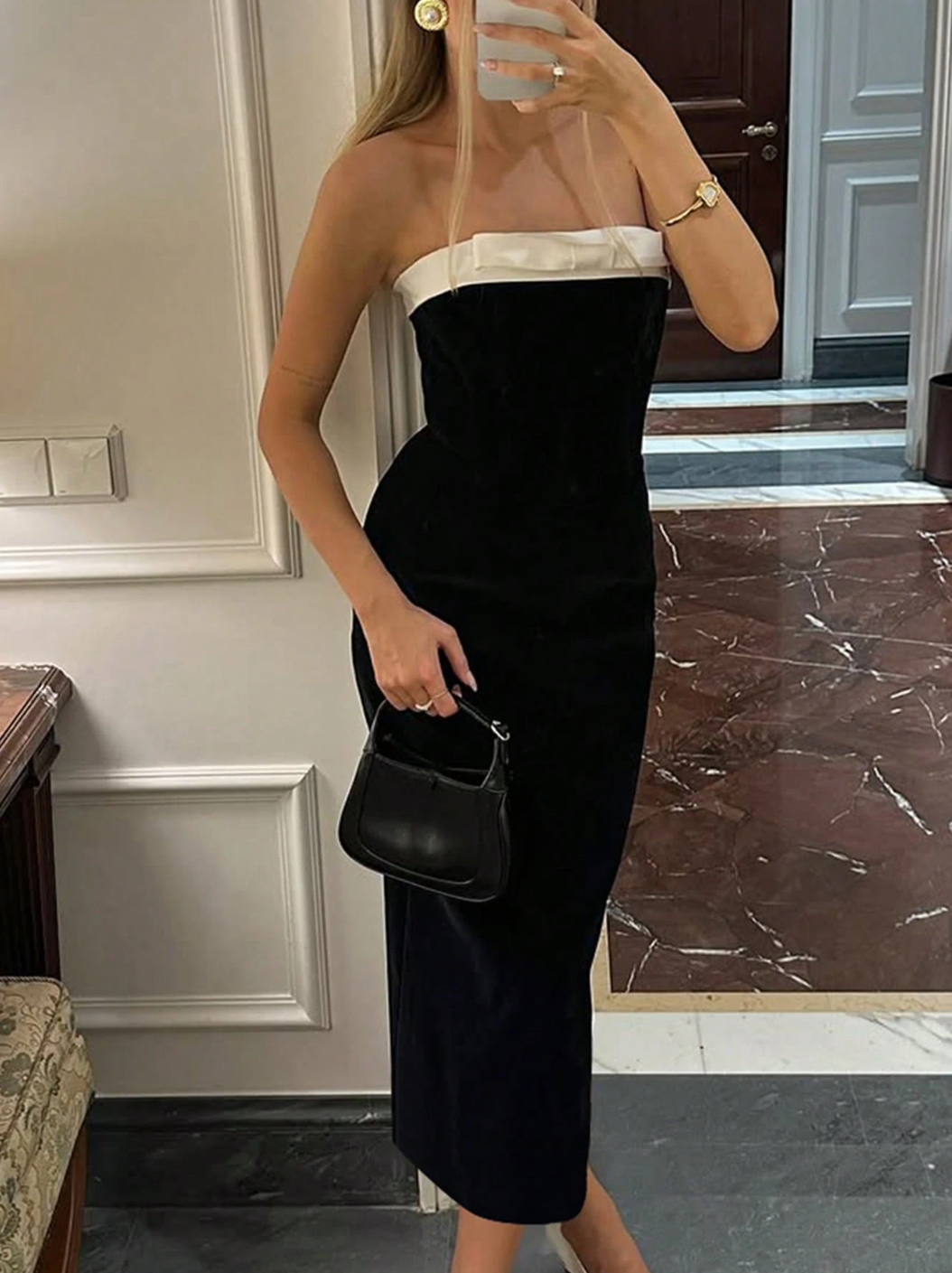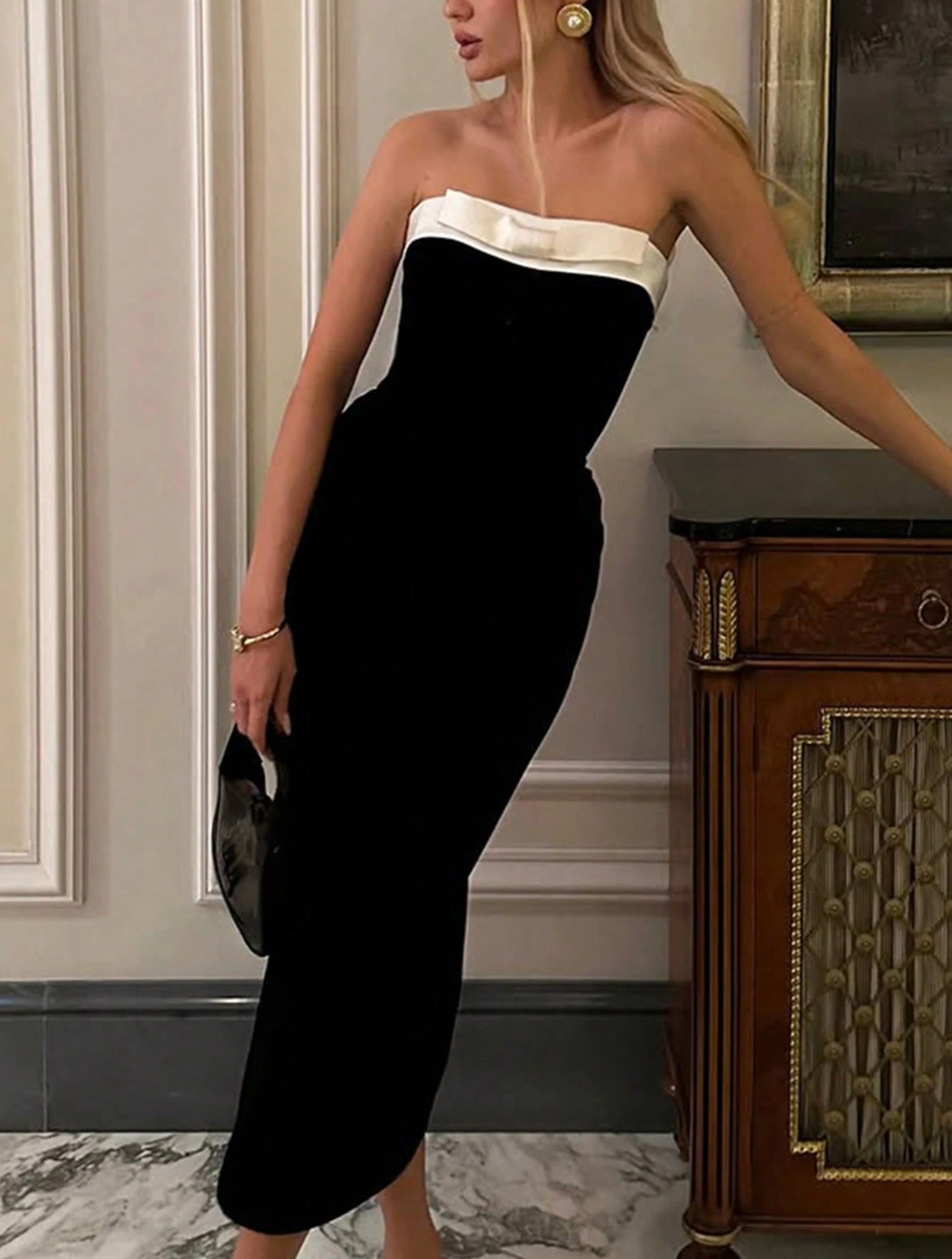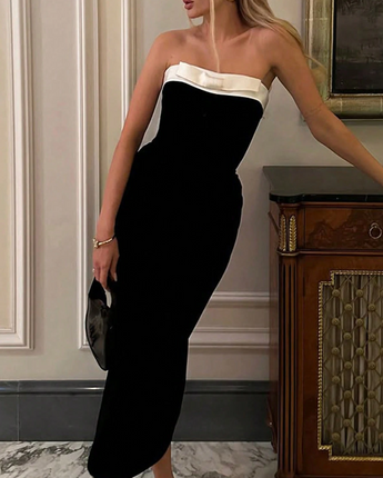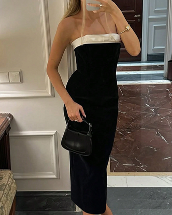 Meet the dress that walked straight out of a luxury Parisian soirée and into your wardrobe. The Gloria A-Line Dress is sleek, elegant and unapologetically sophisticated. With a strapless black velvet body and a crisp white satin fold-over neckline, she’s serving classic Hollywood glam with a modern, dangerously chic twist.