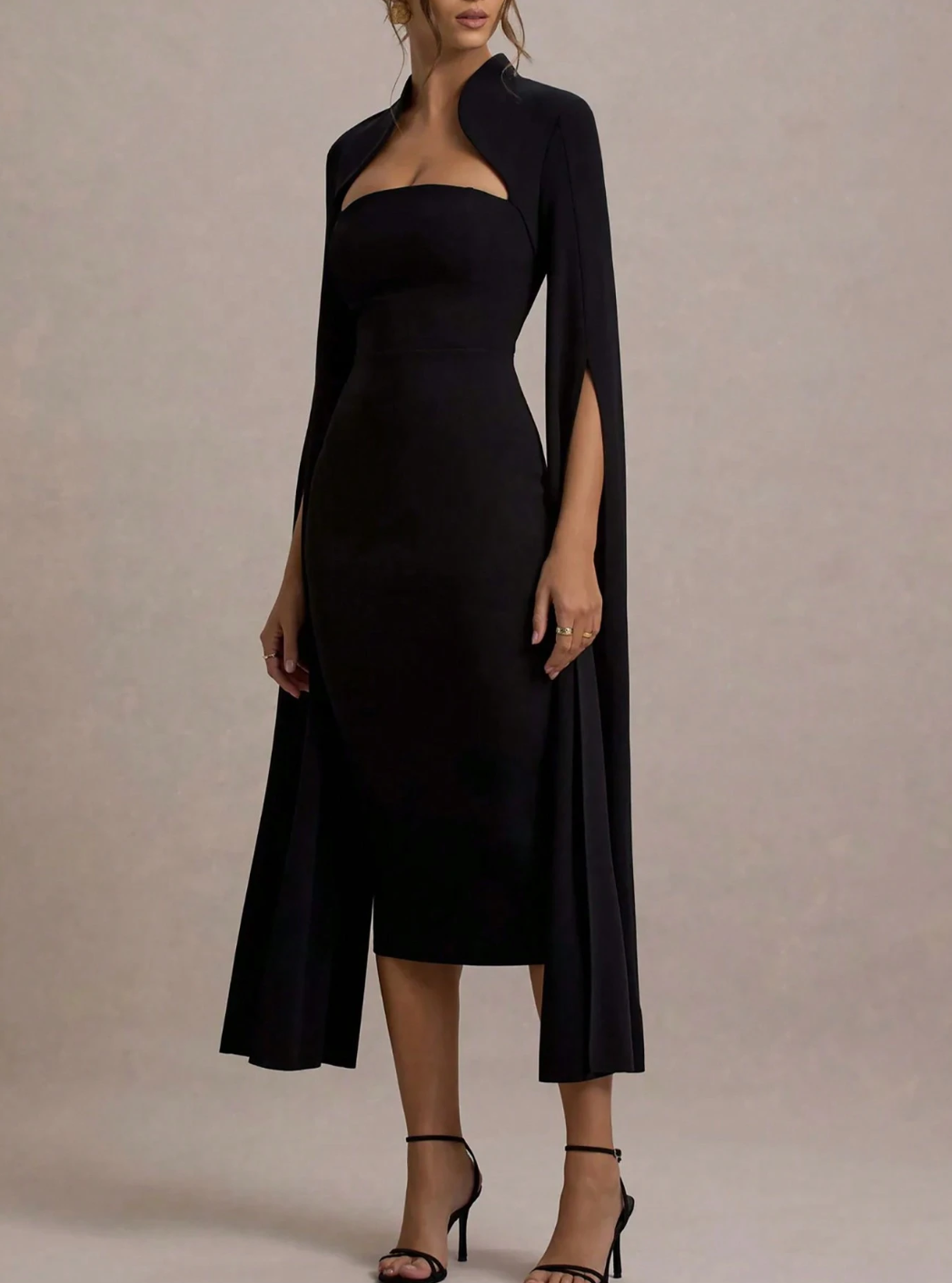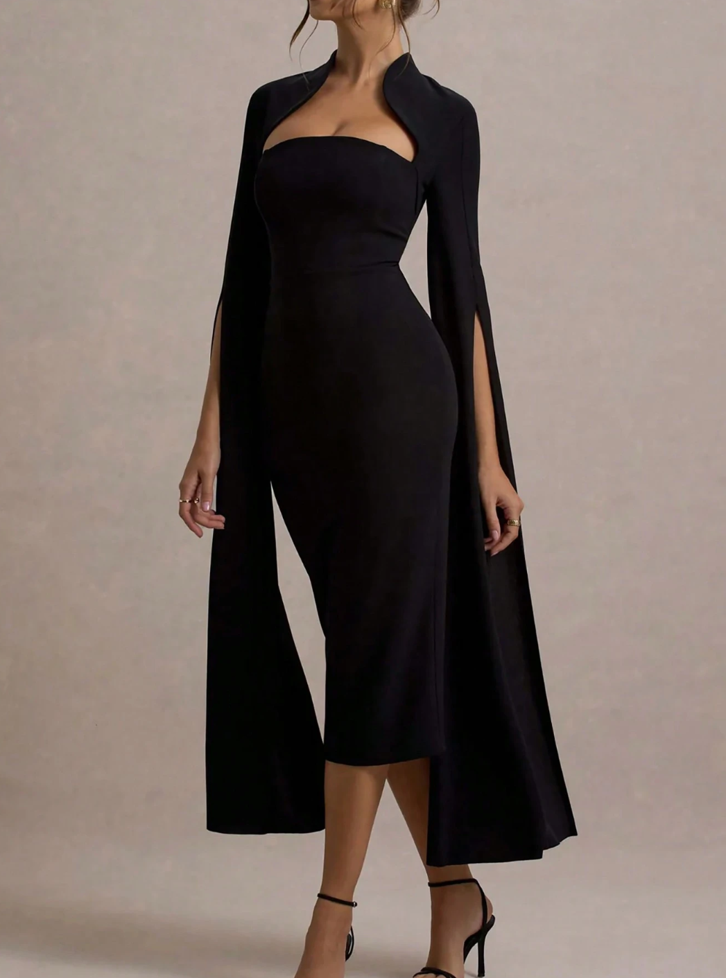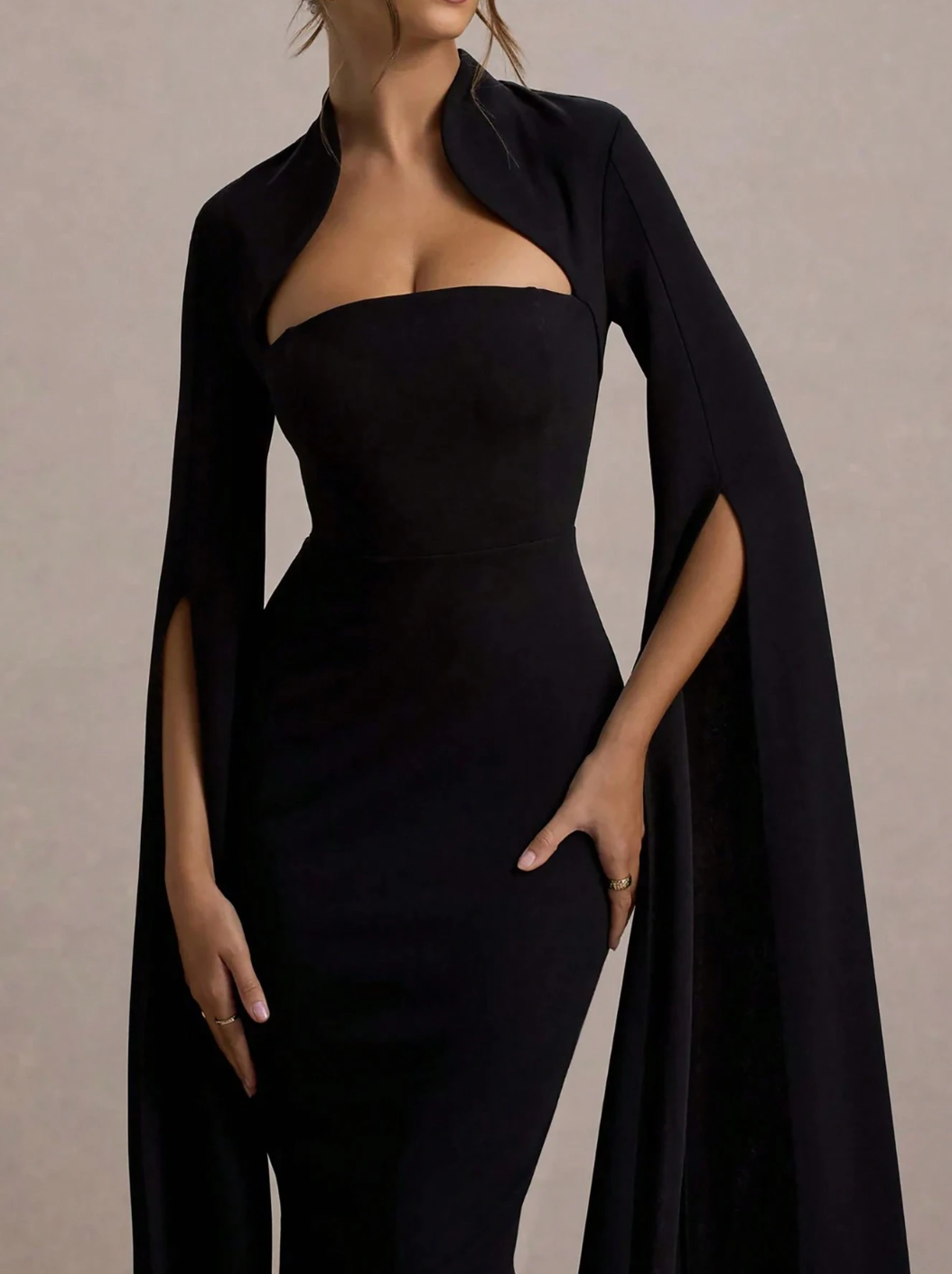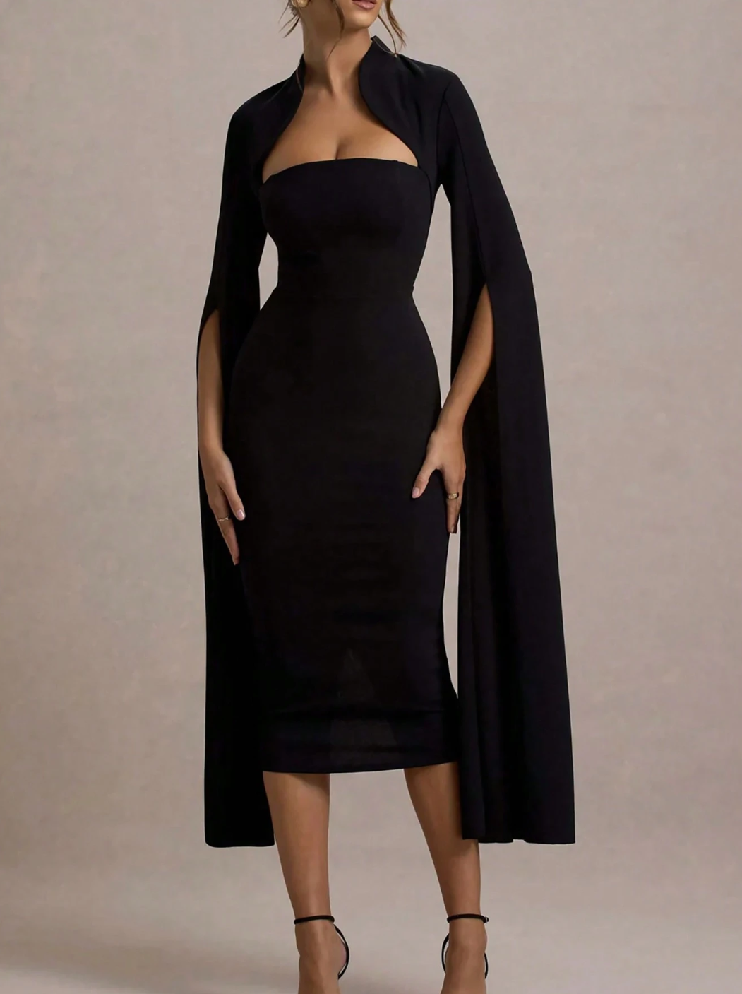 It hugs your curves, snatches the waist, and then casually drapes a cape over your arms like you’re here to accept your award for Being Absolutely Stunning.
