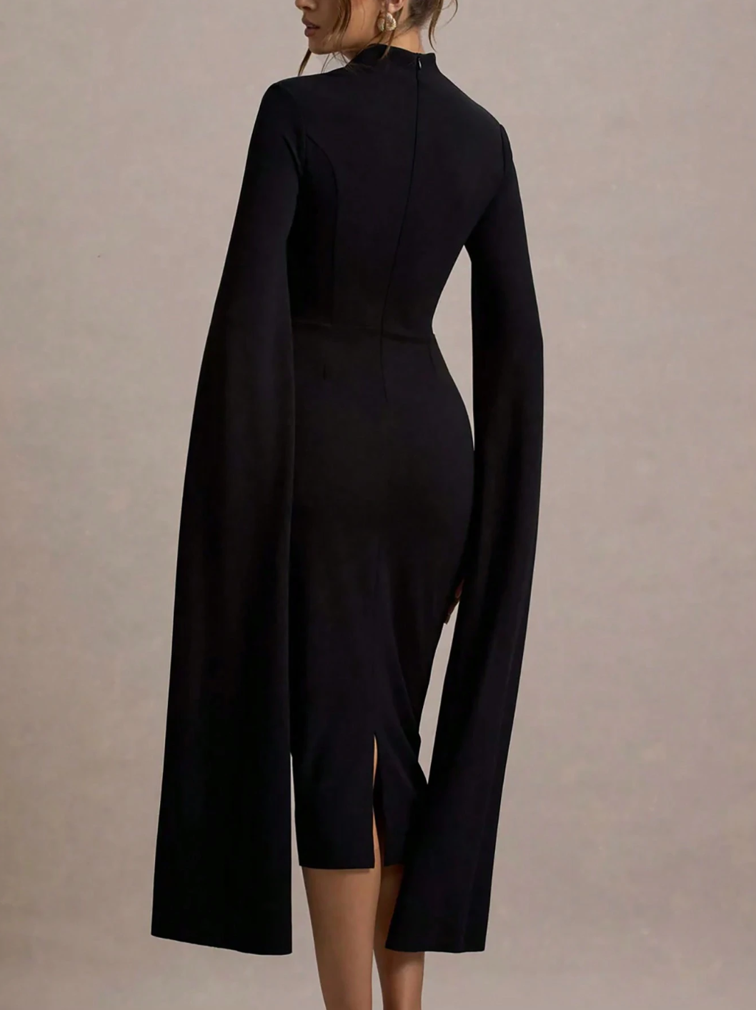 If elegance and drama had a baby, this dress would be it. The Khloe Evening Dress was designed for the woman who walks into a room and makes everyone else rethink their entire wardrobe. With a sculpted bodycon fit and those jaw-dropping cape sleeves, this beauty serves red-carpet sophistication with zero effort.