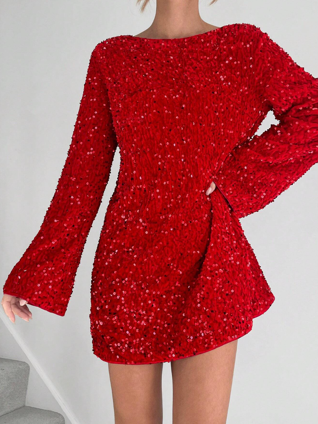 The relaxed long sleeves balance the sparkle with a luxe, effortless vibe, while the mini cut keeps things fun and flirty. Then you turn around… and boom.