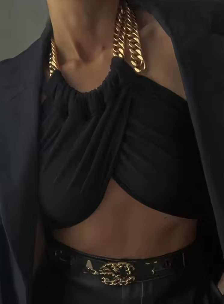 This isn't just a crop top - it's your secret weapon for looking like you have a personal stylist when you definitely just threw this on. The built-in chain detail means you're automatically accessorized! Fair warning: may cause sudden confidence boosts and an uncontrollable urge to pose dramatically in mirrors.