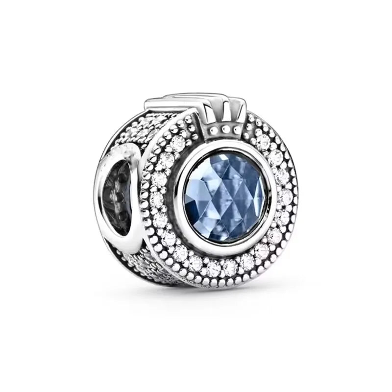 This exquisite round silver charm features a stunning blue stone and is delicately studded with sparkling crystals, adding a touch of elegance to your collection.