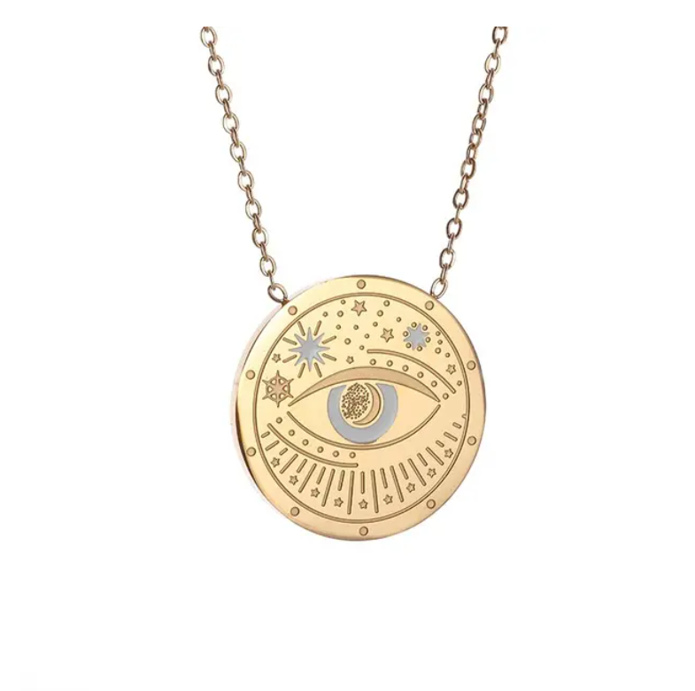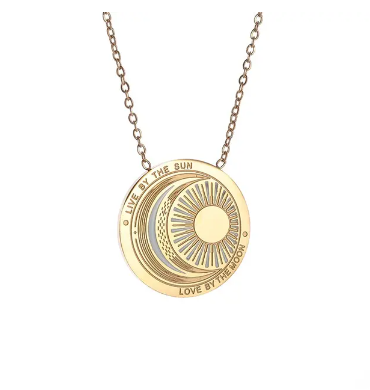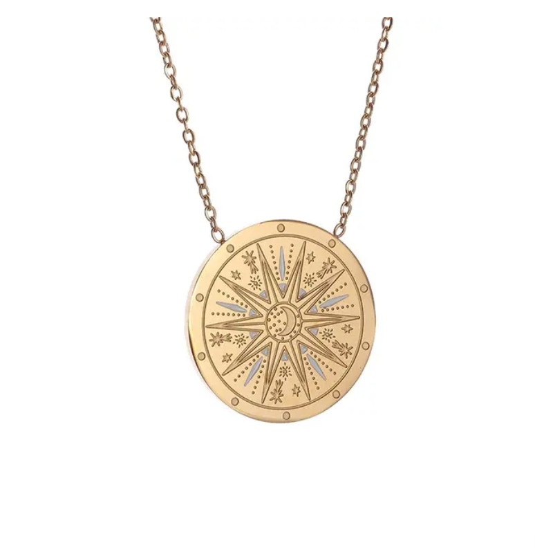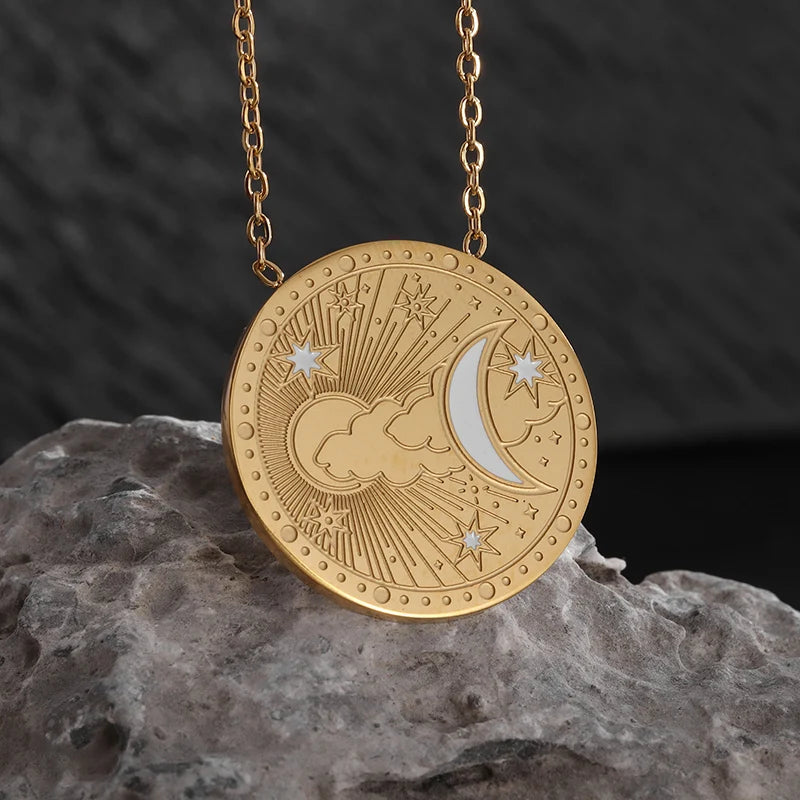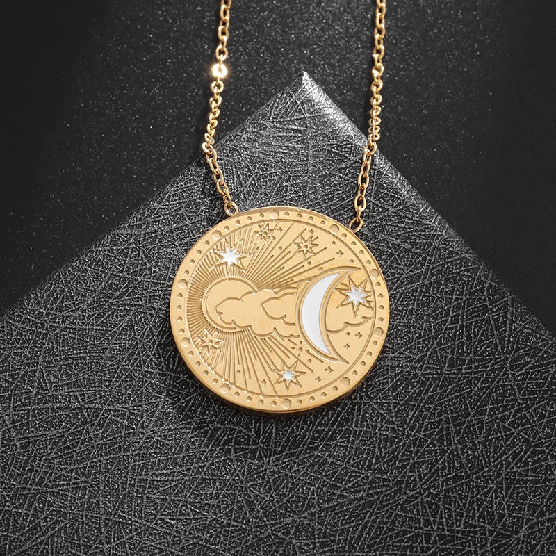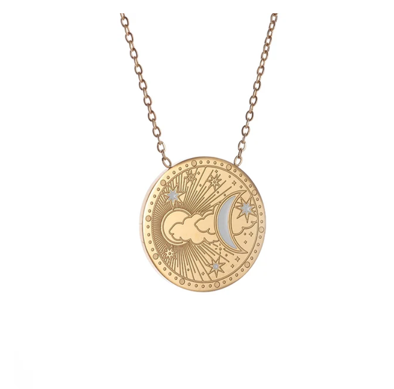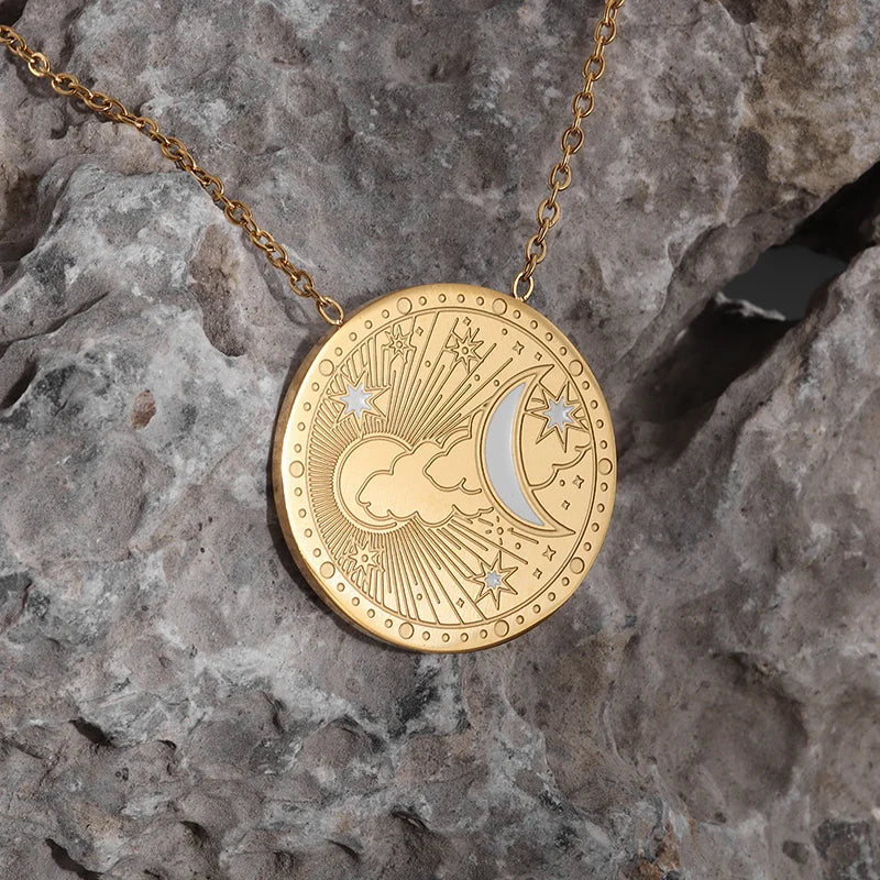 Crafted with care, these 18K gold plated necklaces feature a round pendant adorned with five different depictions of the moon, sun, and celestial sky.