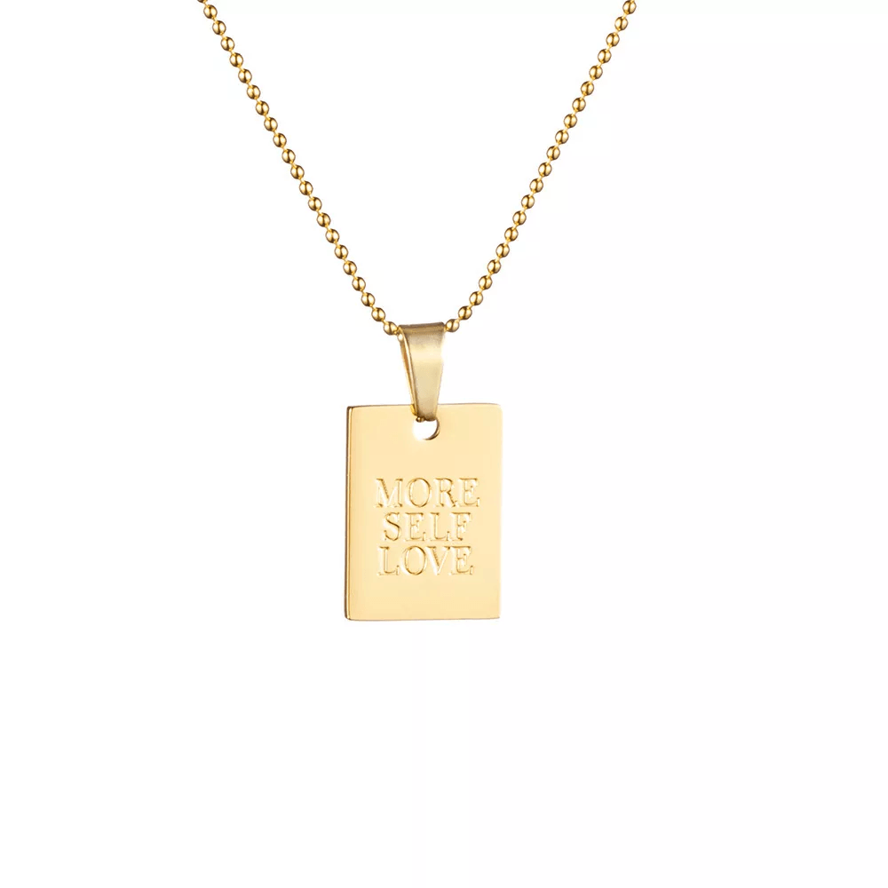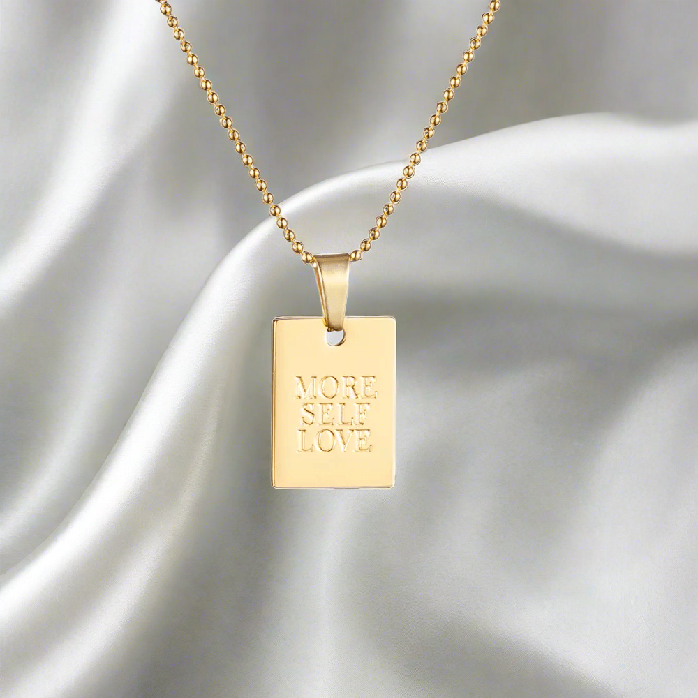 This stunning piece of jewelry is made from stainless steel with a luxurious 18K gold plate. The elegant design radiates positive vibes with its “More Self Love” motif.