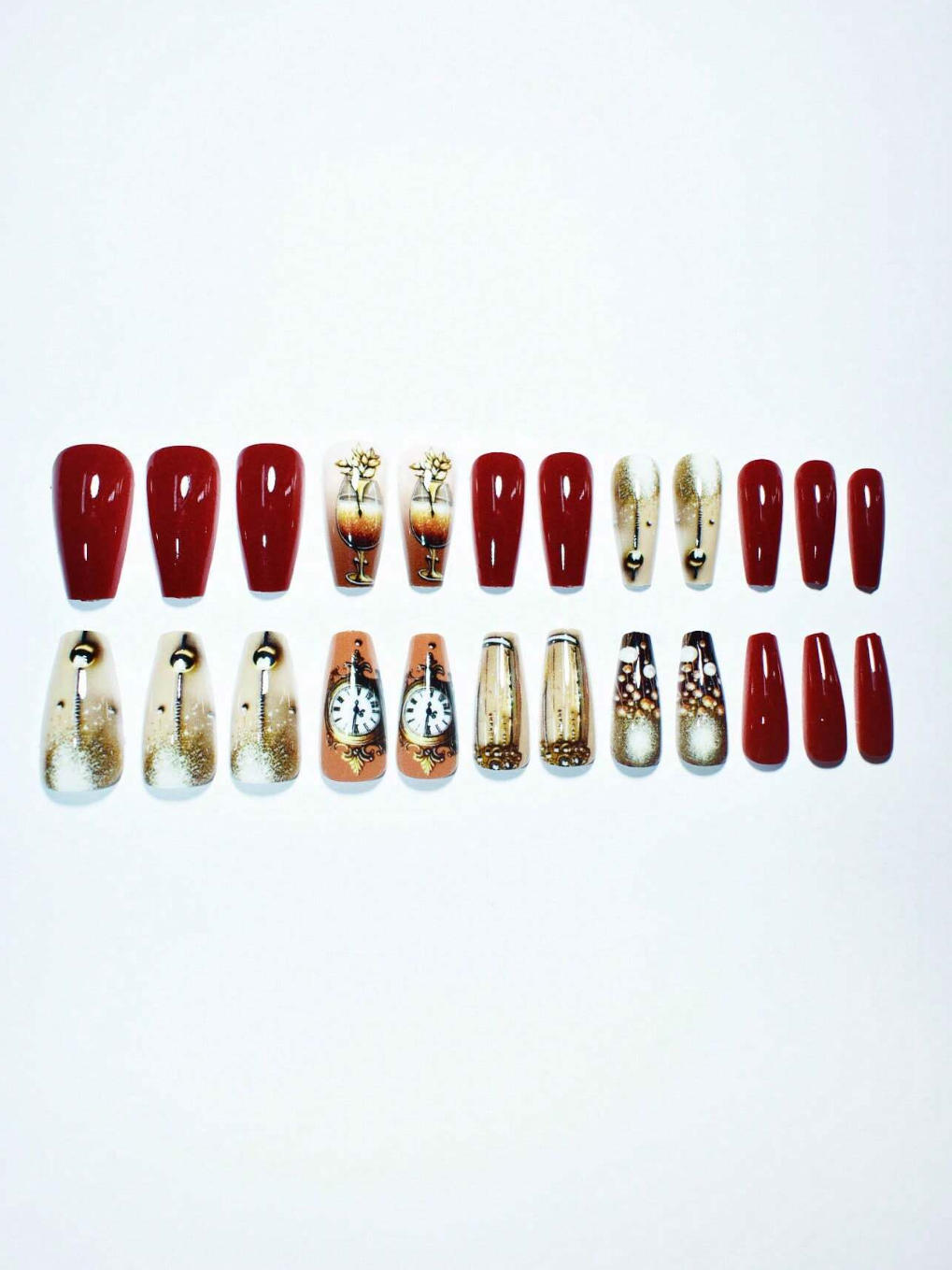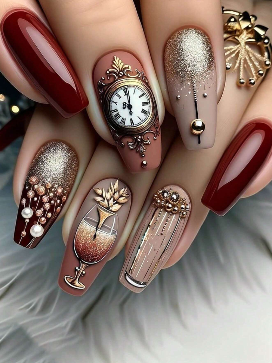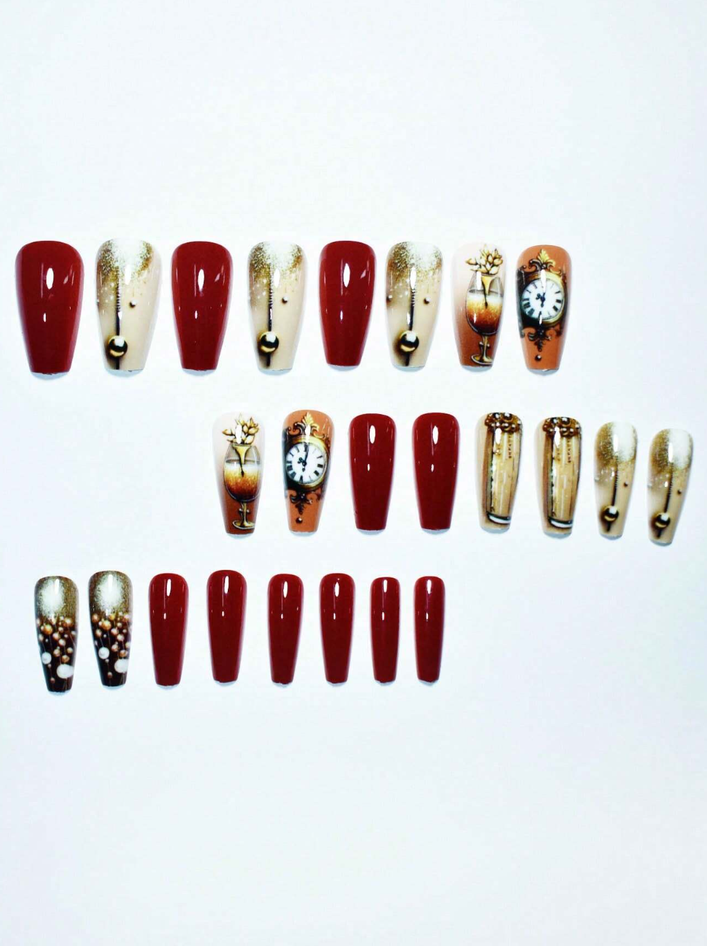 From the deep red gloss to intricate clock faces adorned with pearls, every detail speaks to sophistication. The glittering champagne flute design adds a touch of celebration, perfect for any special occasion.